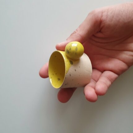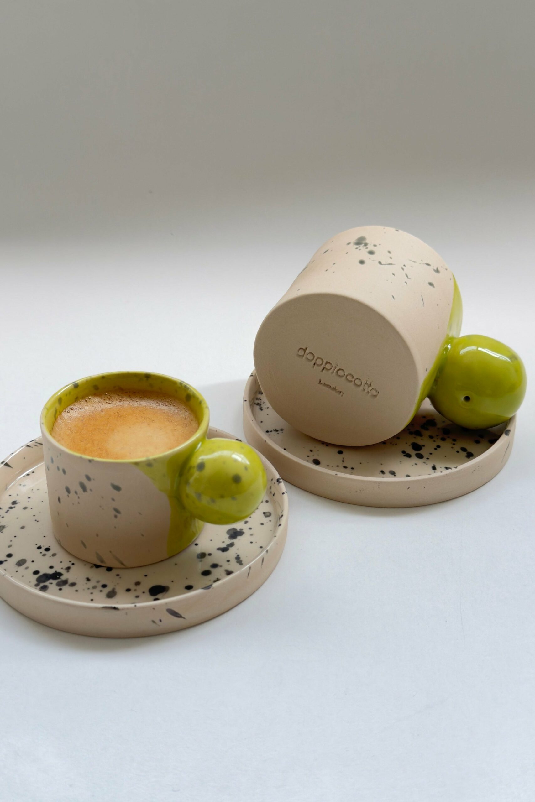 Measures approximately Ø 2.75″ (7 cm) x height 2″ (5 cm). Weighs about 3.5 oz (100 g).•Microwave and Dishwasher Safe: For your convenience.•Handcrafted Design: Each mug is meticulously hand-shaped and fired at 1250°C, ensuring a unique and high-quality finish.•Glossy Finish: Adds a touch of elegance to your coffee experience.•Colour and Finish: Raw beige with a glaze. The saucer has a black splash glaze.•Material: Stoneware ceramic, handcrafted without moulds.