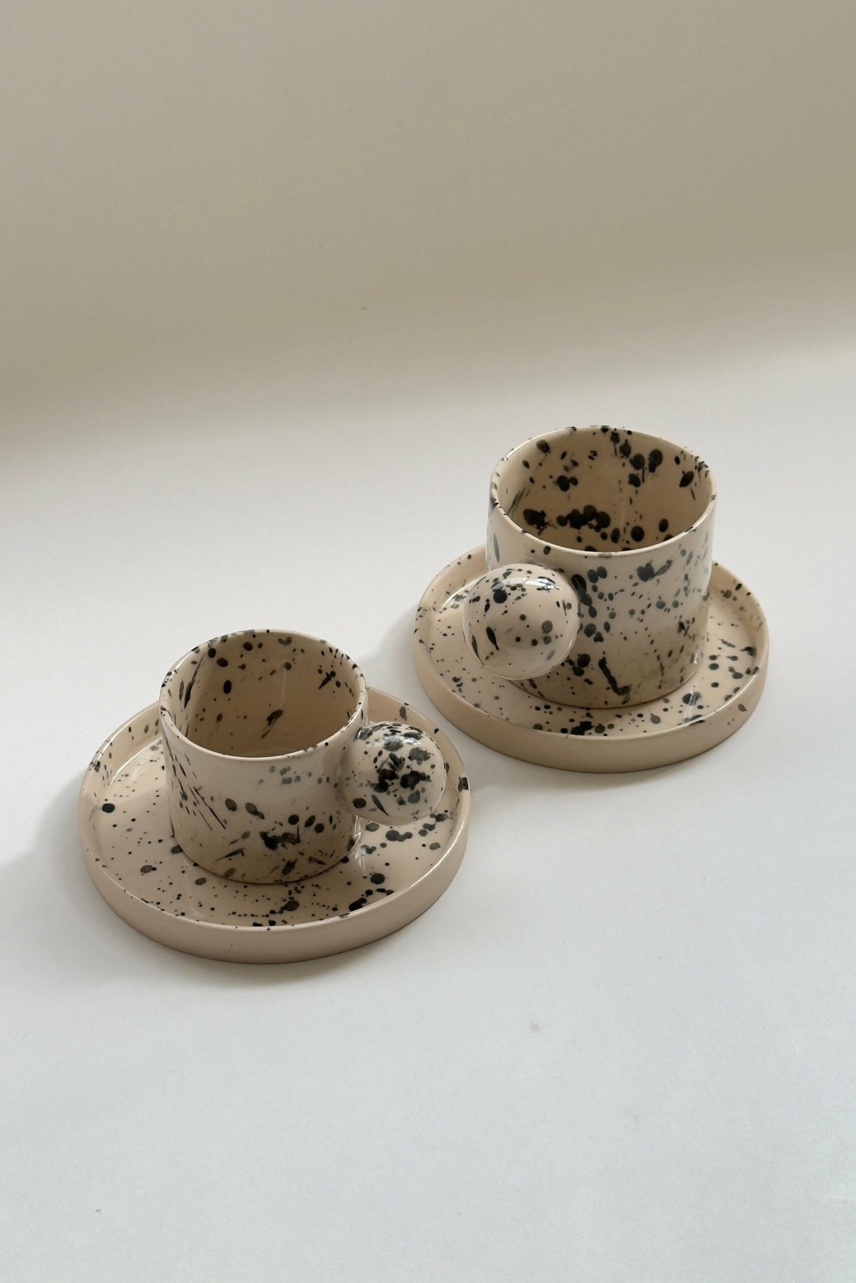 150 ml handmade beige with black splashed ceramic mug and saucer set