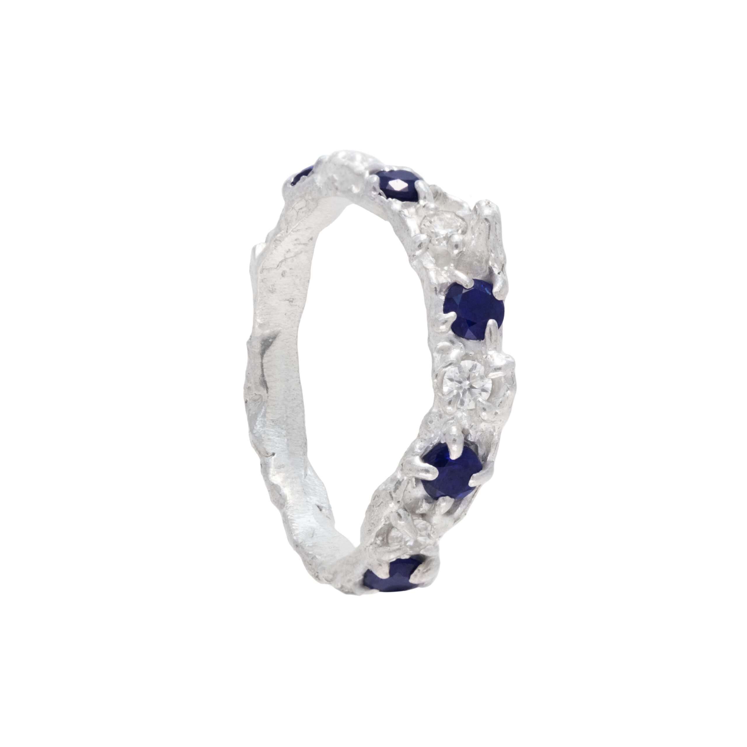 Alba Sapphire Moissanite Argenti Ring – A timeless classic reinvented with a modern contemporary twist. This ring seamlessly merges a sinuate, textured silver band with the allure of alternating lab-grown sapphires and moissanites, reminiscent of a half eternity style. Its design effortlessly balances tradition and innovation.