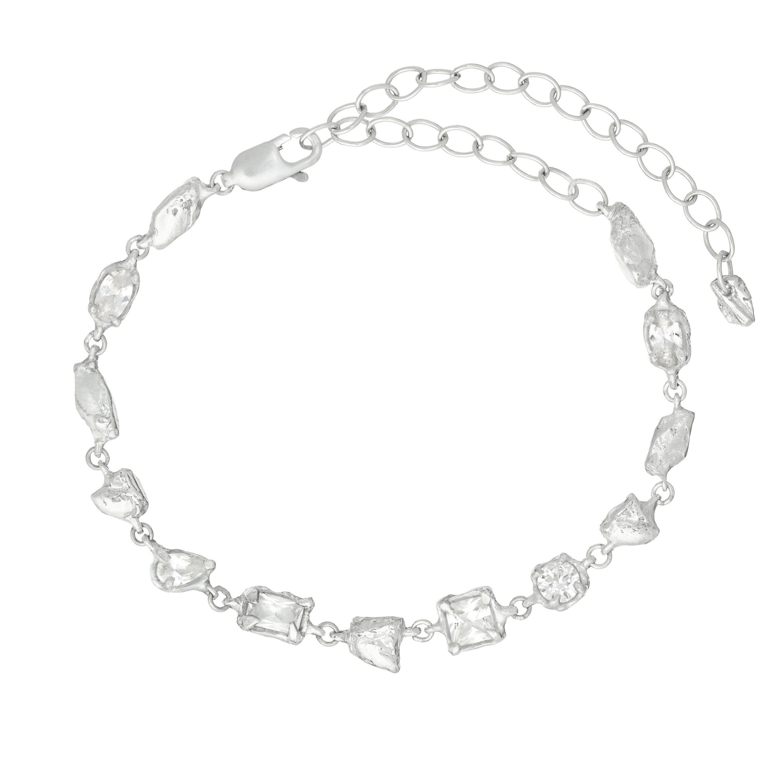 Ara White Sapphire Argenti Bracelet – This charmingly delicate bracelet features miniature textured silver components seamlessly interspersed with lab-grown white sapphires of varying shapes and sizes. Its refined design allows it to be worn solo for a subtle touch or layered with other bracelets for a striking, personalised look. Embrace the versatility and unique charm of this delicate bracelet, perfect for adding a hint of sparkle and grace to any ensemble.