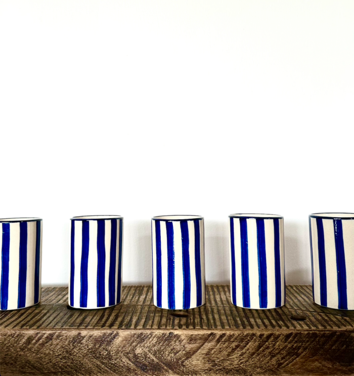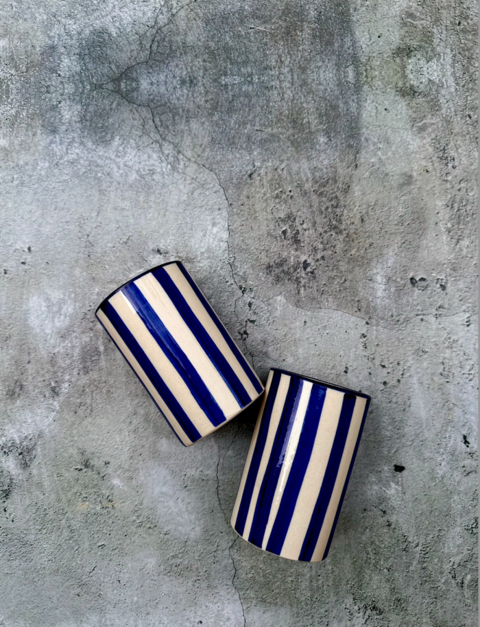 Hand-thrown stoneware coffee cups, adorned with hand-painted indigo stripes on a natural clay base. Each piece is crafted by hand, celebrating timeless simplicity and everyday ritual.