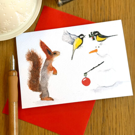 This card showcases a badger in the midst of a quiet woodland scene. The badger is focused on foraging for winter berries, its paws gently reaching towards a bush heavy with ripe fruit. The soft blanket of snow around it hints at the chill in the air, but the badger’s persistence and quiet determination capture the resilience of animals as they prepare for the colder months.