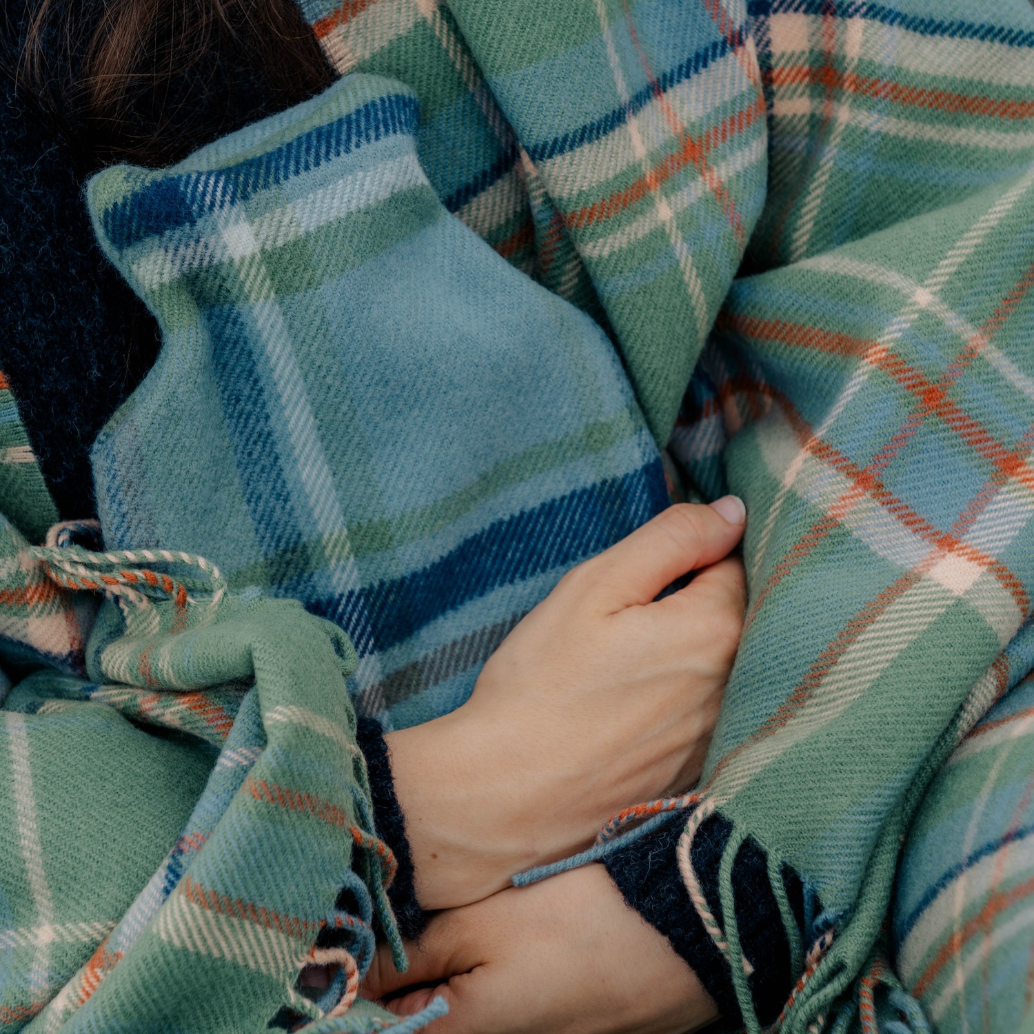 100% Lambswool – luxuriously soft, naturally warm and comfortable, inspired by Scotland’s Woodlands sunlight, leaves and blue skies.