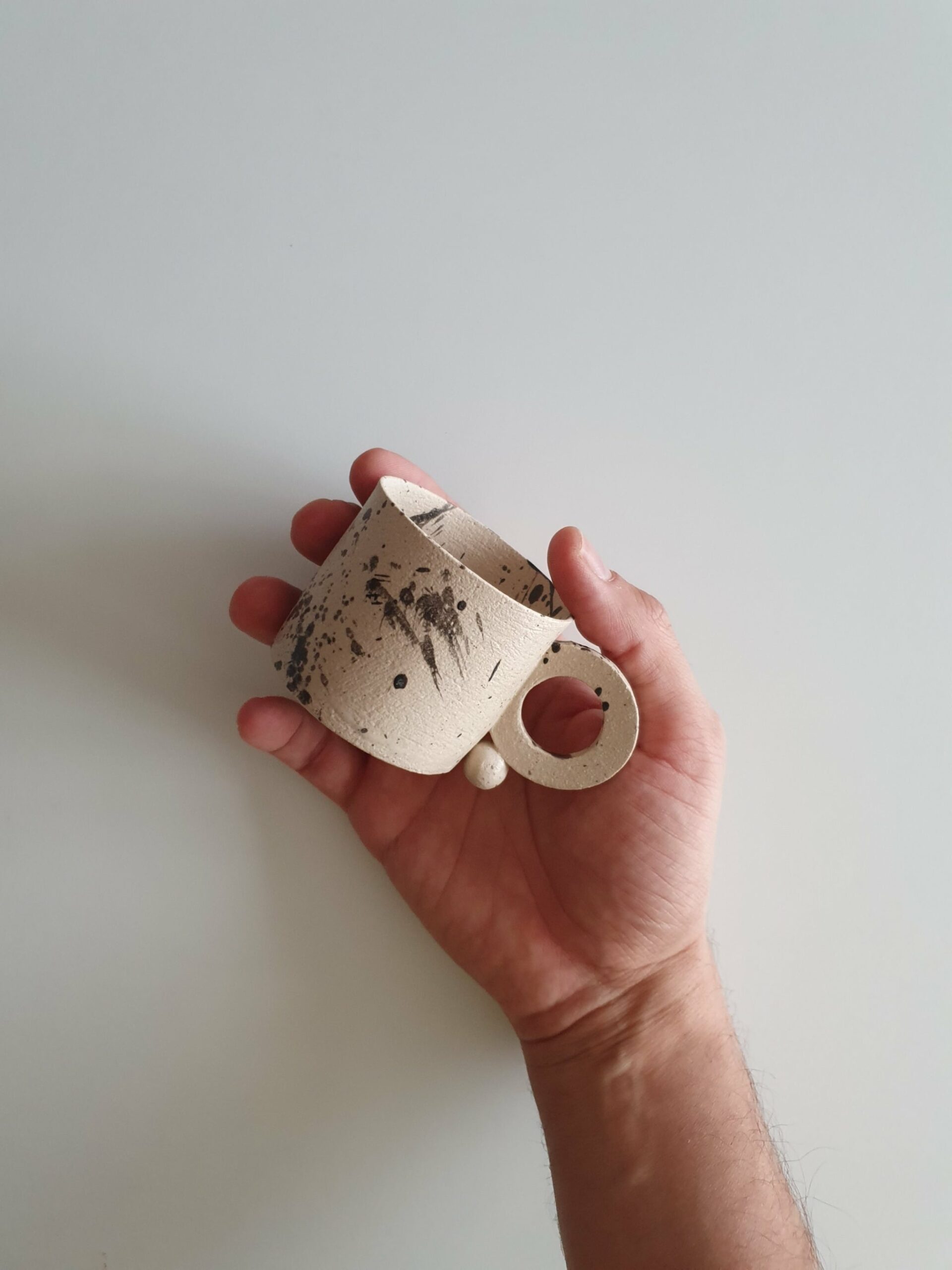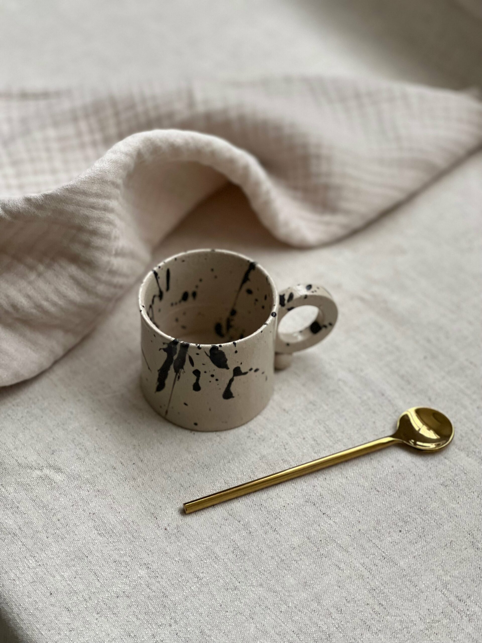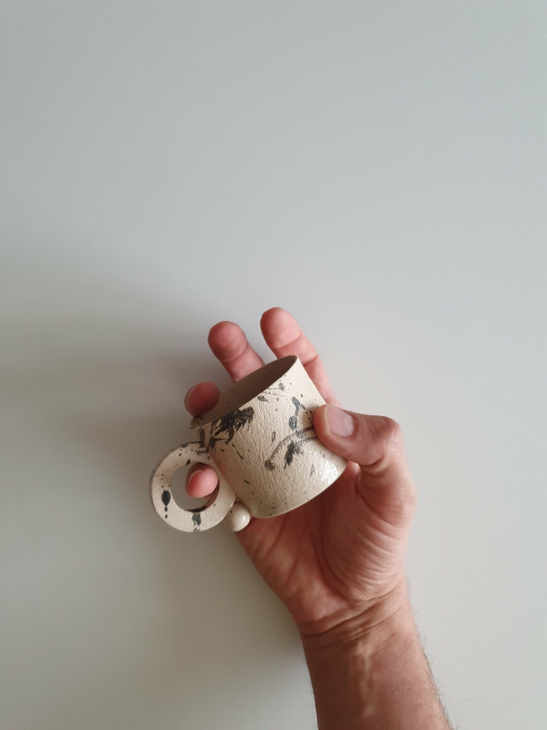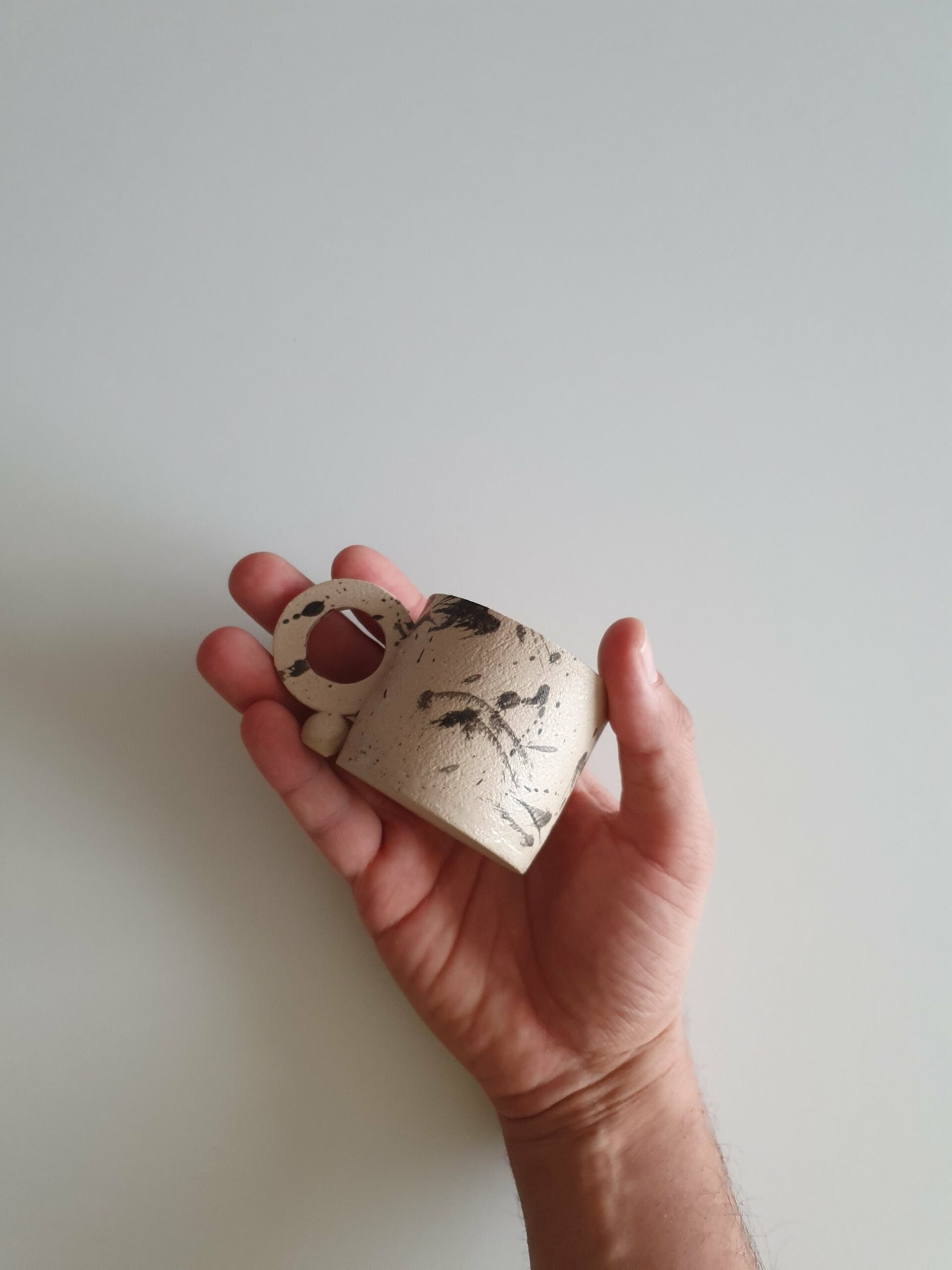 The 5 oz volume beige stoneware ceramic mug is handmade and prepared with the slab method, which is one of the ceramic forming methods. The cup, which is fired at 1250 degrees Celsius with a splash of black paint on it, is very solid and strong. For design lovers, it will offer you warm drinks with its minimal design. Since they are completely handmade, they may create color, texture, and shape differences among themselves. It is suitable for washing in the dishwasher. Suitable for microwave.Cup sizes:Diameter 6.5 cm (2.55 inches)Height 5.5 cm (2.16 inches)Average capacity: 5 fl ozWe hope you like the products,(The price is valid for one product.)Each of the products has its own boxes and they are packaged.Feel happy while using it…