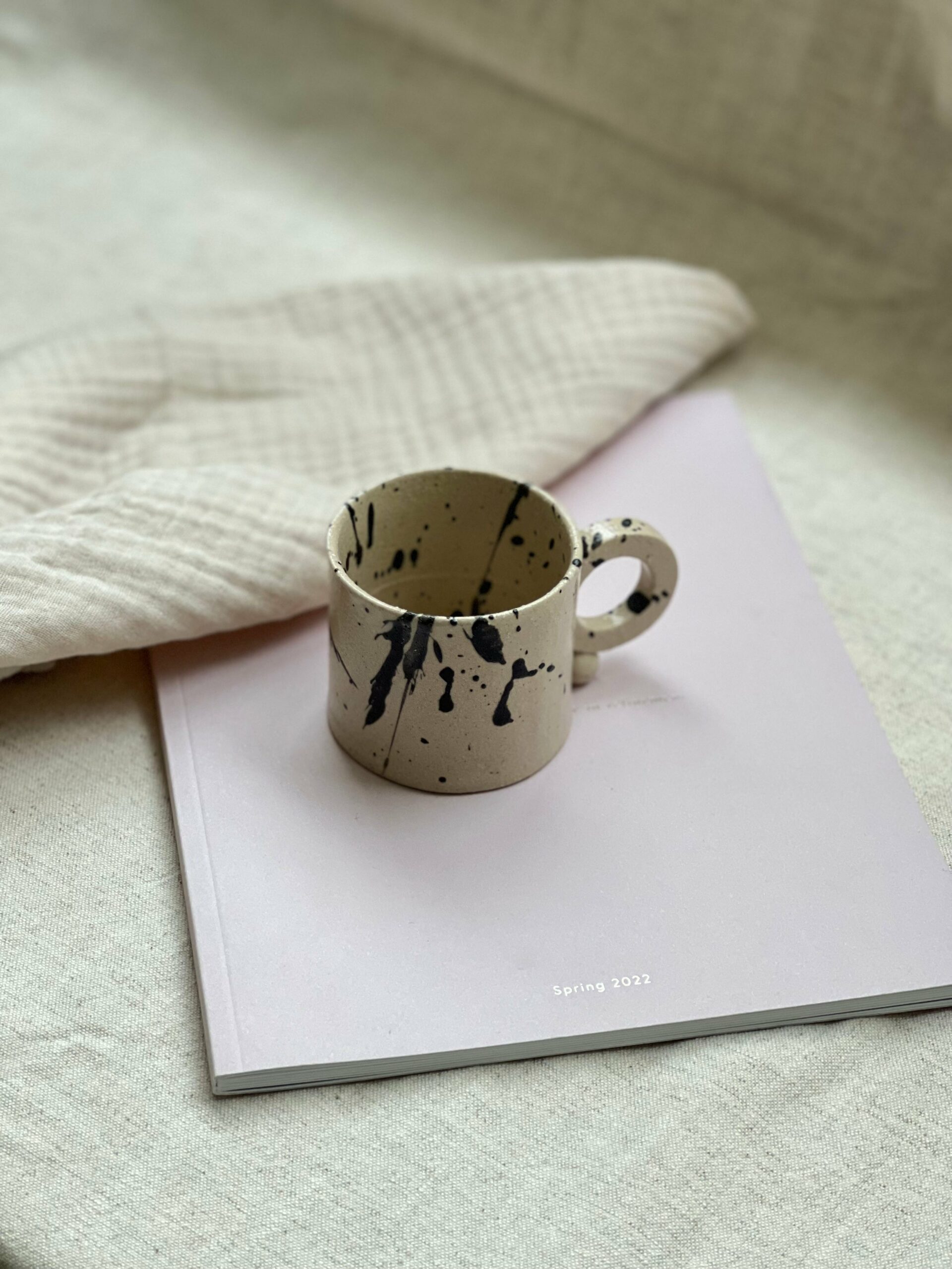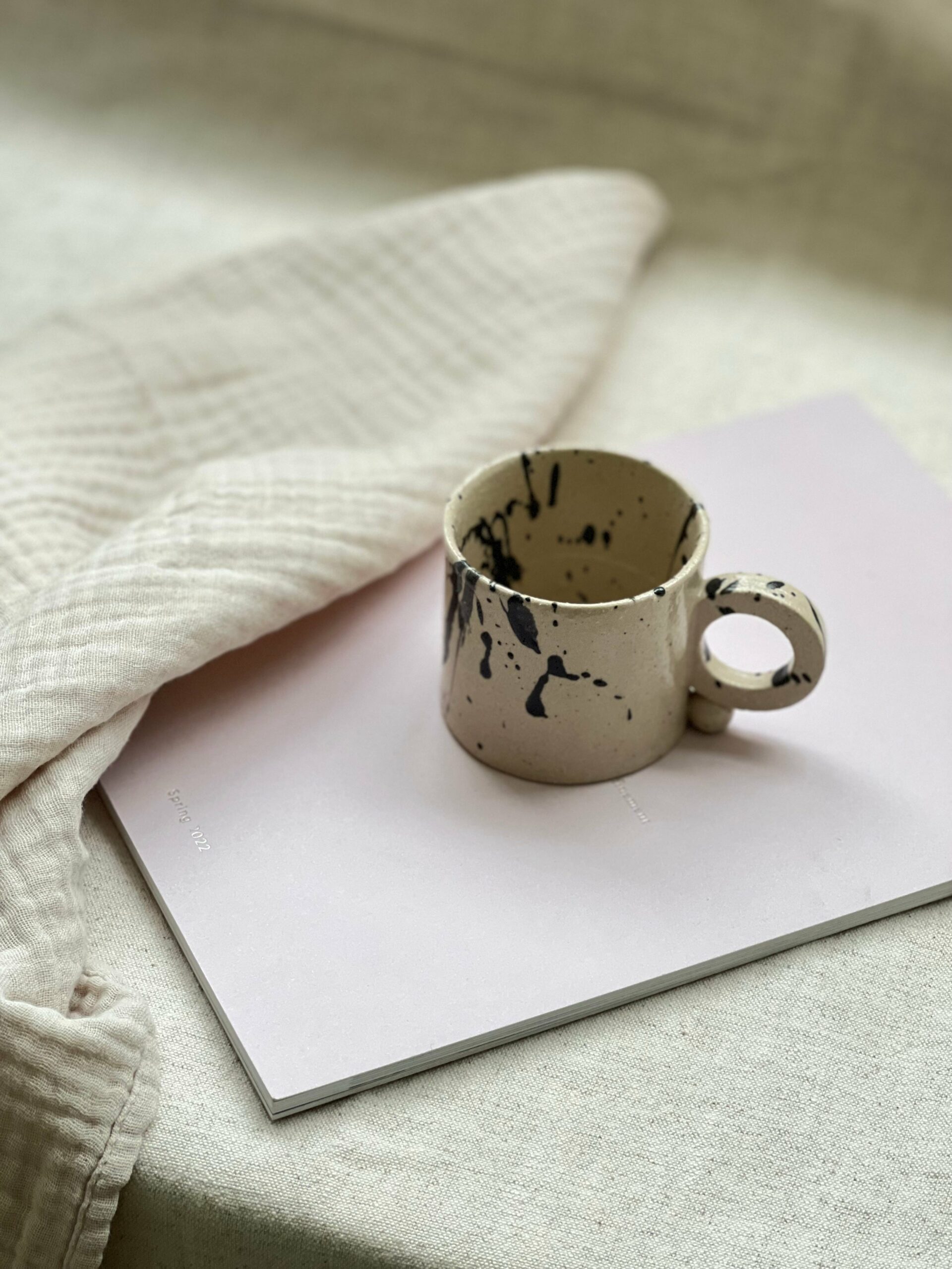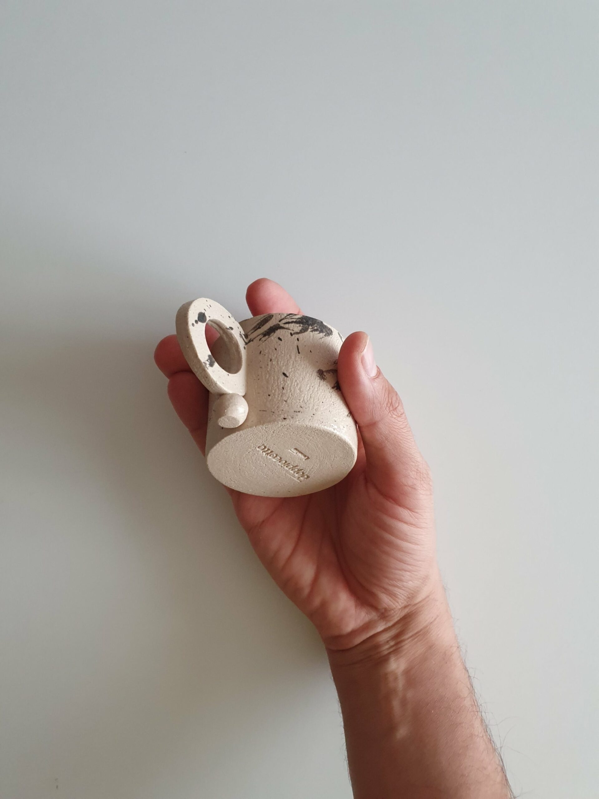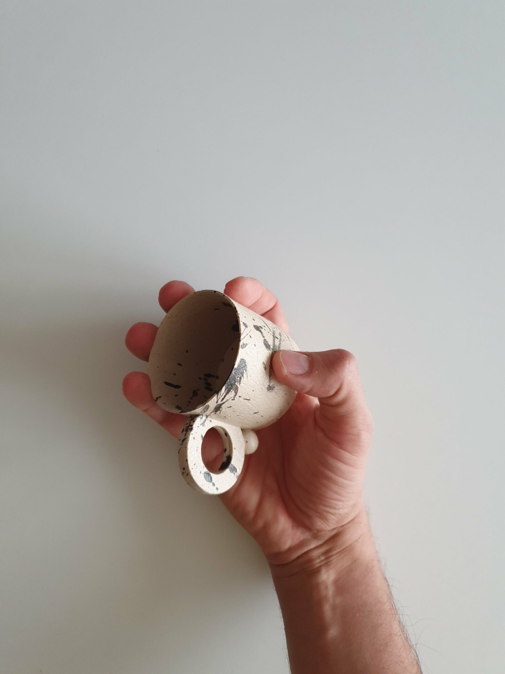 The 5 oz volume beige stoneware ceramic mug is handmade and prepared with the slab method, which is one of the ceramic forming methods. The cup, which is fired at 1250 degrees Celsius with a splash of black paint on it, is very solid and strong. For design lovers, it will offer you warm drinks with its minimal design. Since they are completely handmade, they may create color, texture, and shape differences among themselves. It is suitable for washing in the dishwasher. Suitable for microwave.Cup sizes:Diameter 6.5 cm (2.55 inches)Height 5.5 cm (2.16 inches)Average capacity: 5 fl ozWe hope you like the products,(The price is valid for one product.)Each of the products has its own boxes and they are packaged.Feel happy while using it…