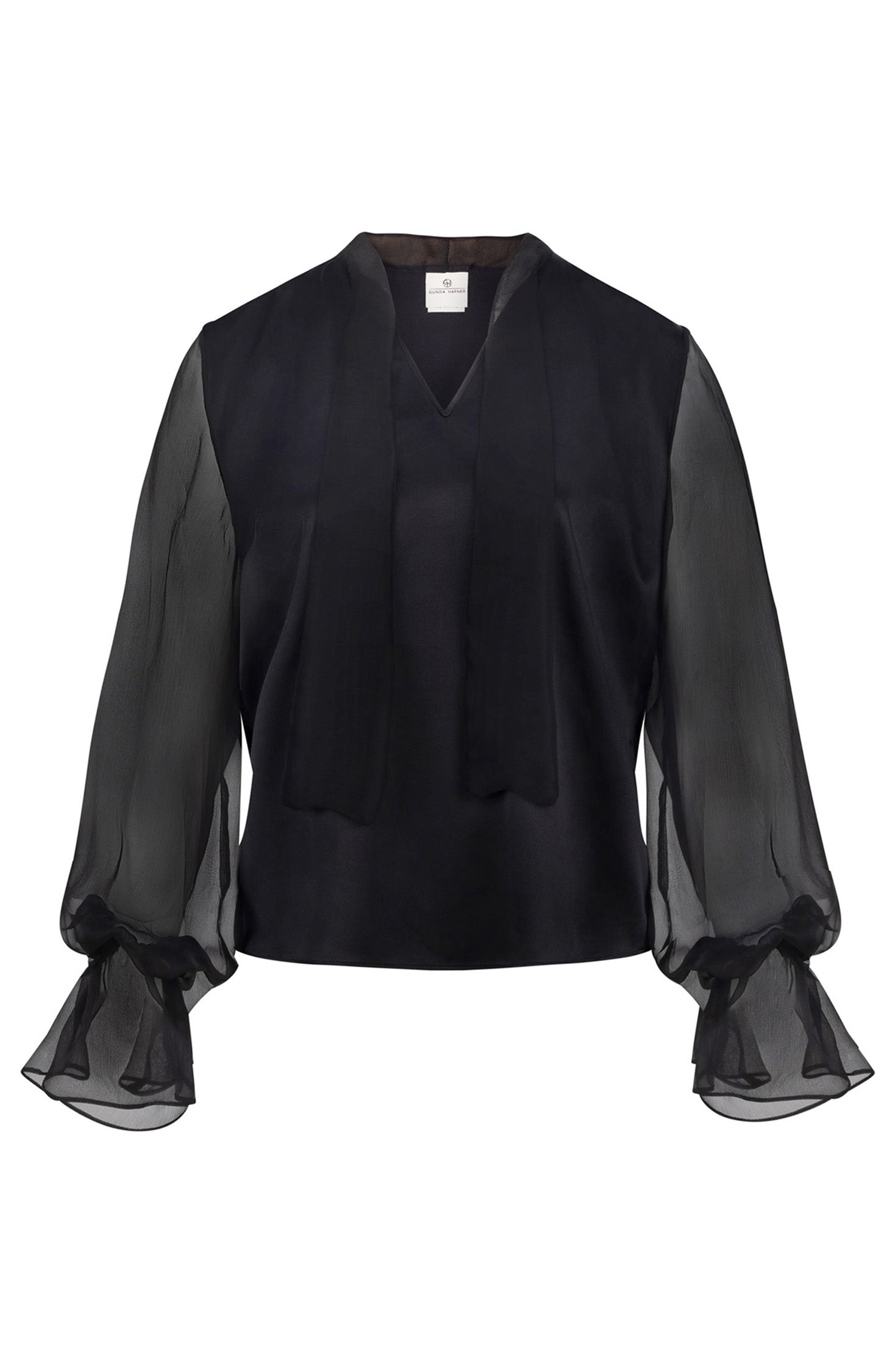 Introducing our elegant black silk top, a perfect fusion of sophistication and modern femininity. Designed with a subtle stretch for comfort, this luxurious piece drapes effortlessly, creating a refined silhouette. The sheer organza sleeves add a delicate, ethereal touch, while the pussy-bow scarf brings timeless charm and versatility.
