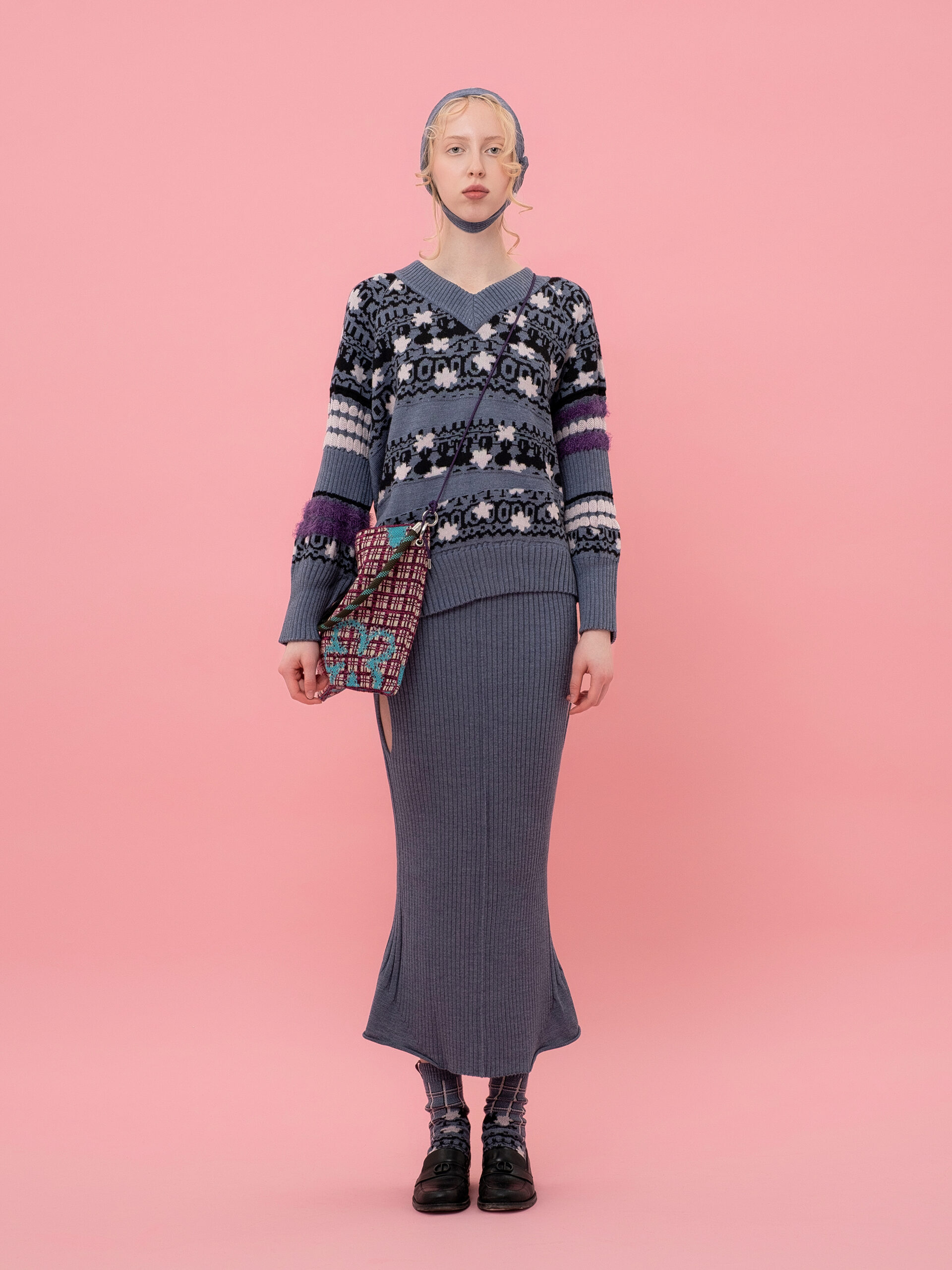 This jacquard-knitted jumper is designed for an oversized fit and has dramatic ribbed trims and fluffy details. Wear yours with a white T-shirt peeking out from the V-neckline.