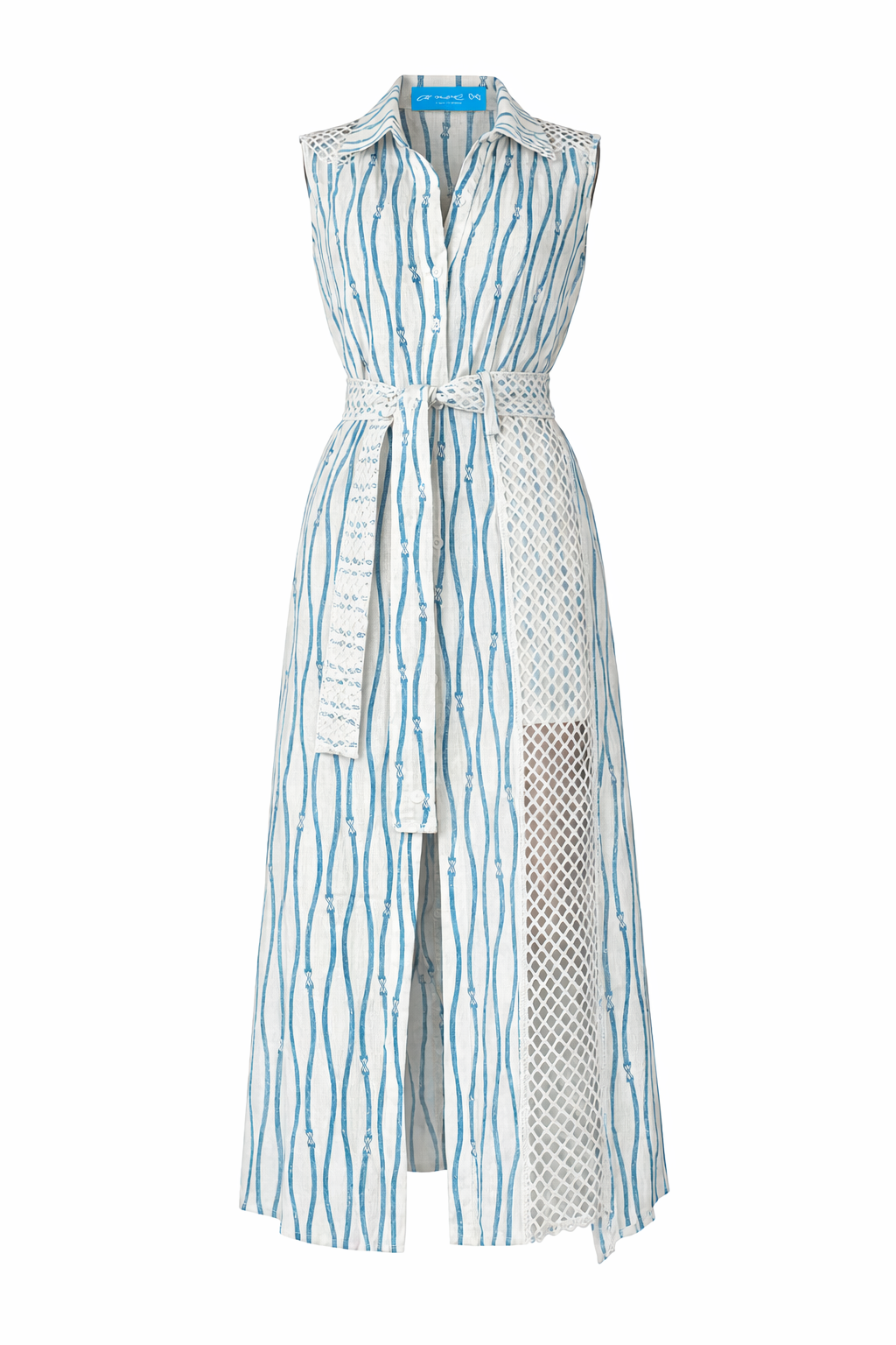 A statement piece with effortless charm, this wavy blue print dress is designed to turn everyday moments into something special. Crafted from breathable 100% linen and finished with delicate white linen lace panels, it blends timeless elegance with modern ease.