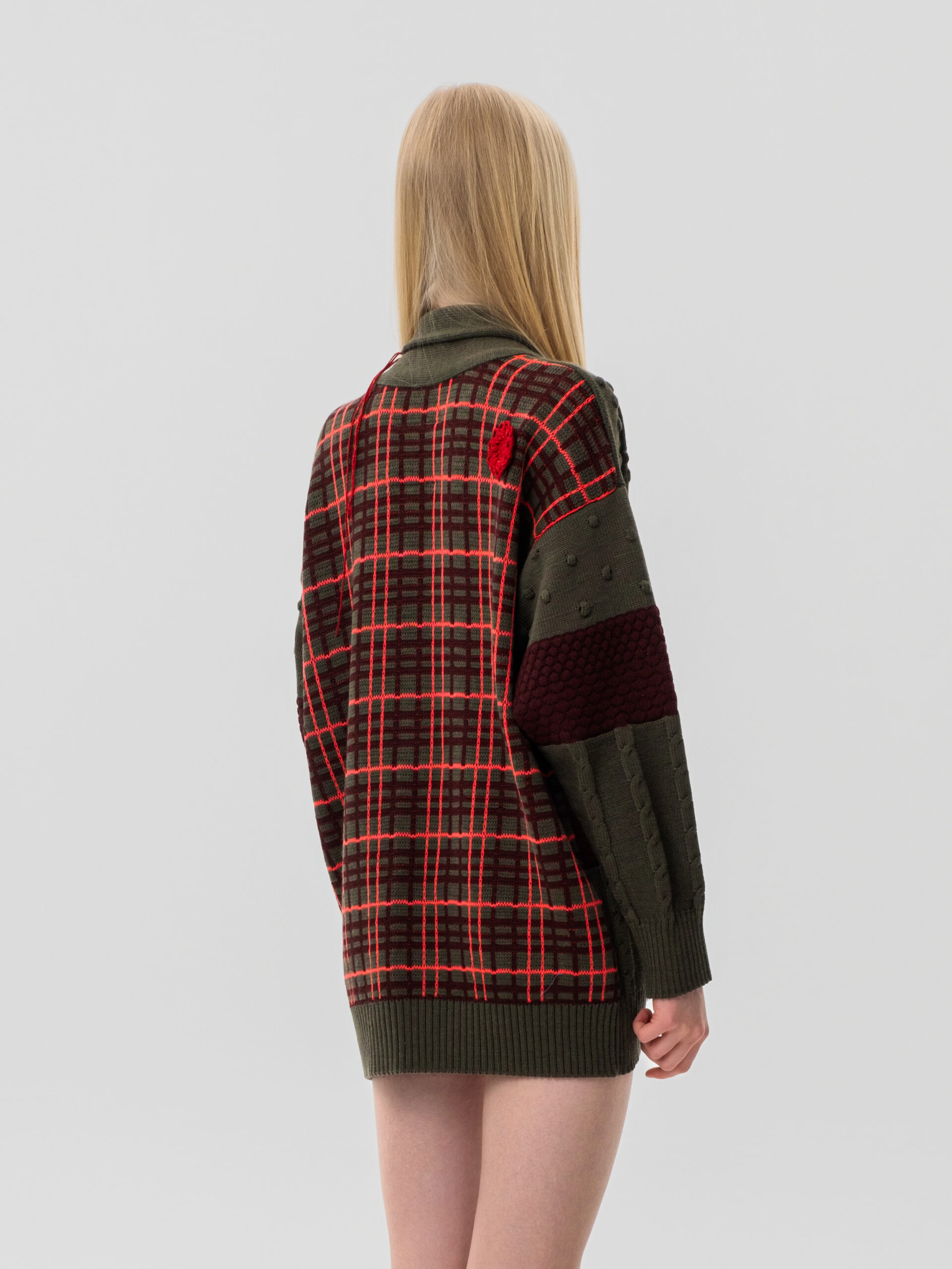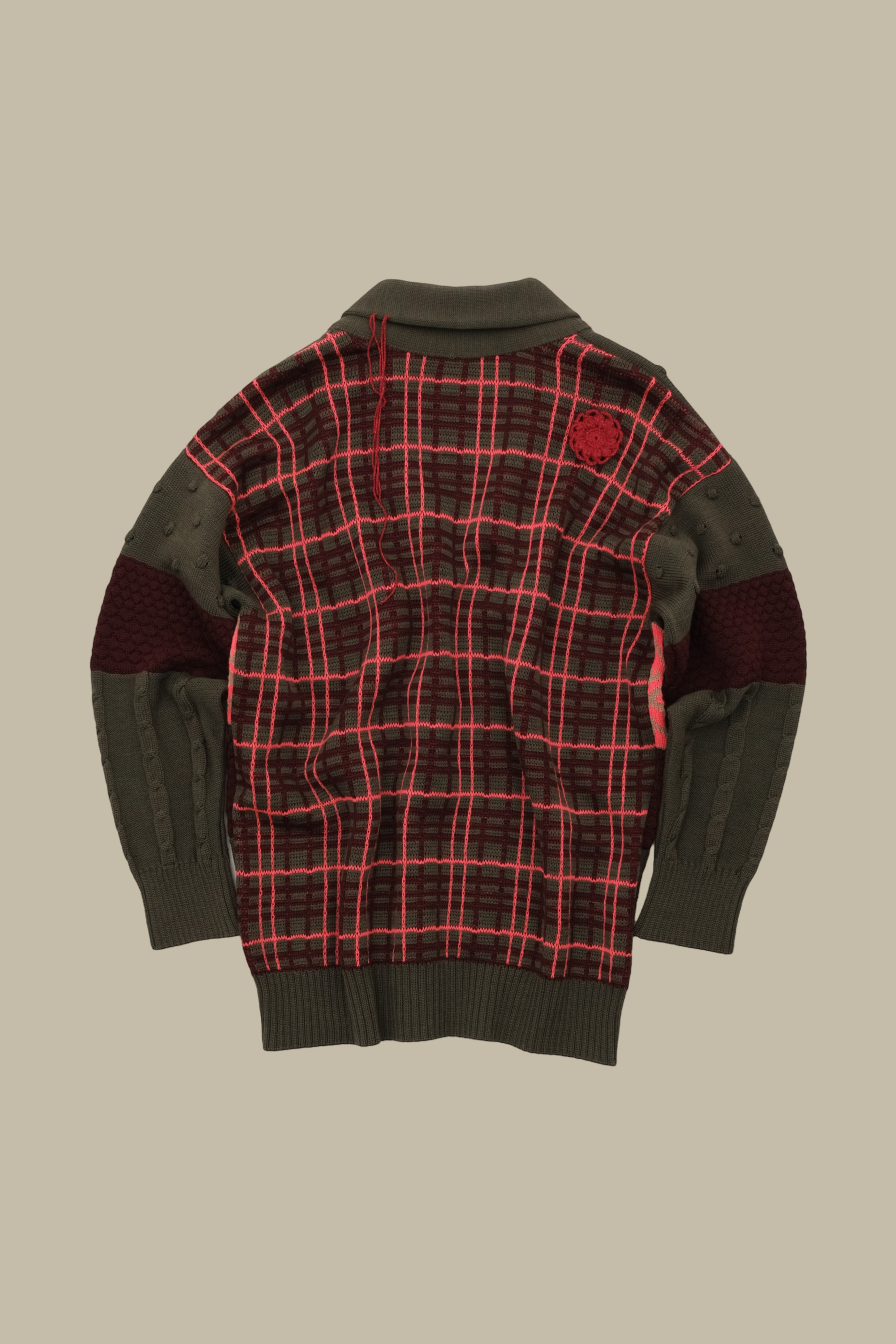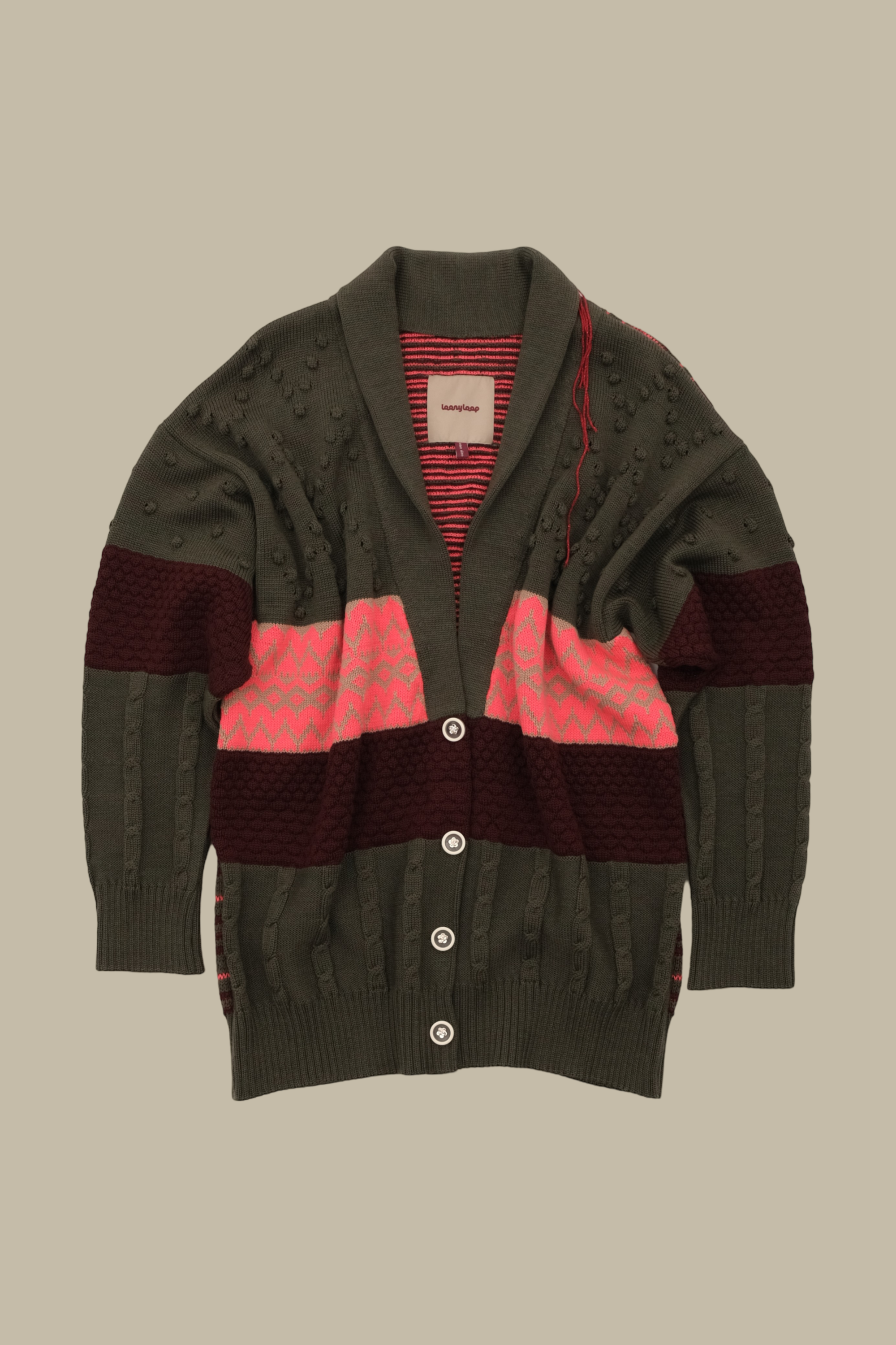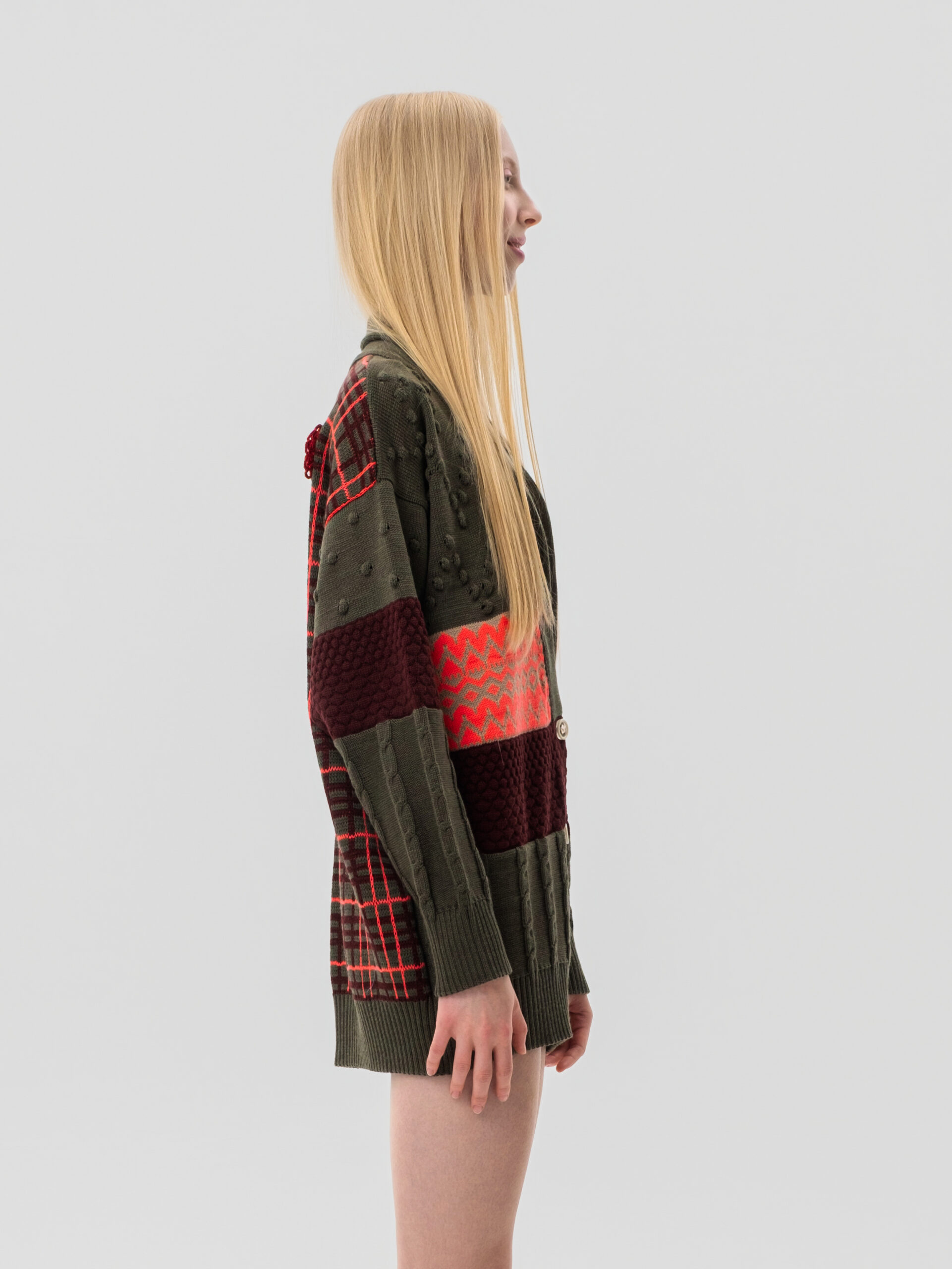 Chunky checked cardigan in green, burgundy and neon with shawl collar, cable knit texture and floral buttons.