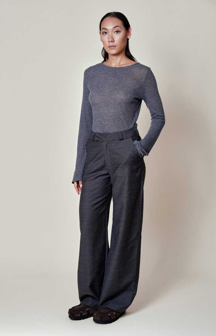 Our best-selling mid-rise trousers are reimagined in a contemporary straight-leg silhouette. Crafted from grey 100% merino wool, they feature a sleek side hook fastening and double pockets with button-and-loop closures, combining refined tailoring with everyday practicality. Designed for comfort and durability, they are a versatile staple for any wardrobe.