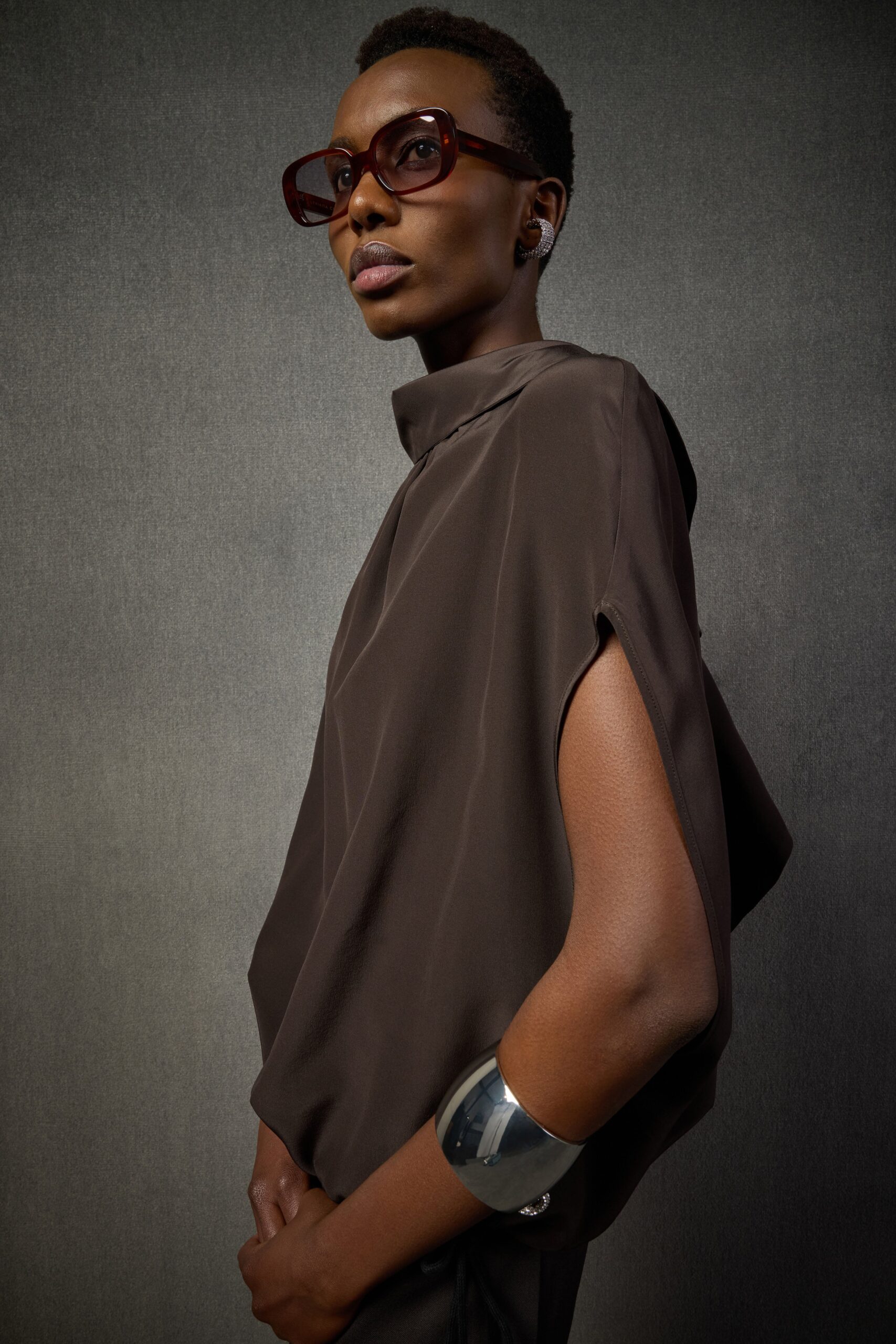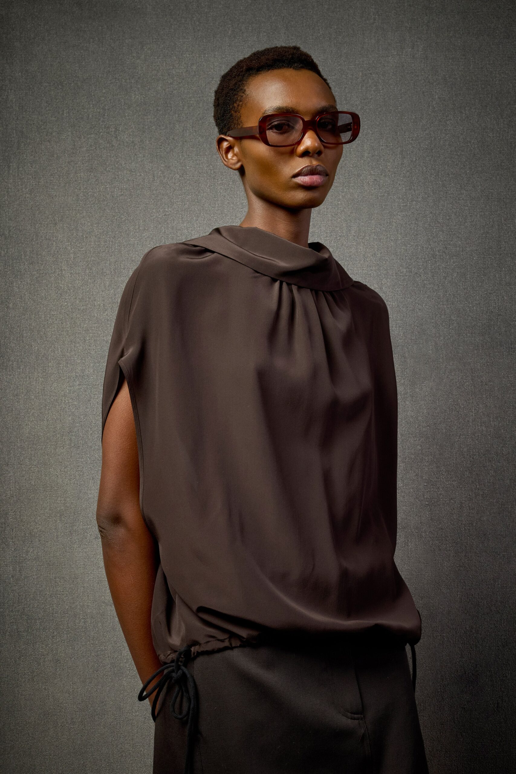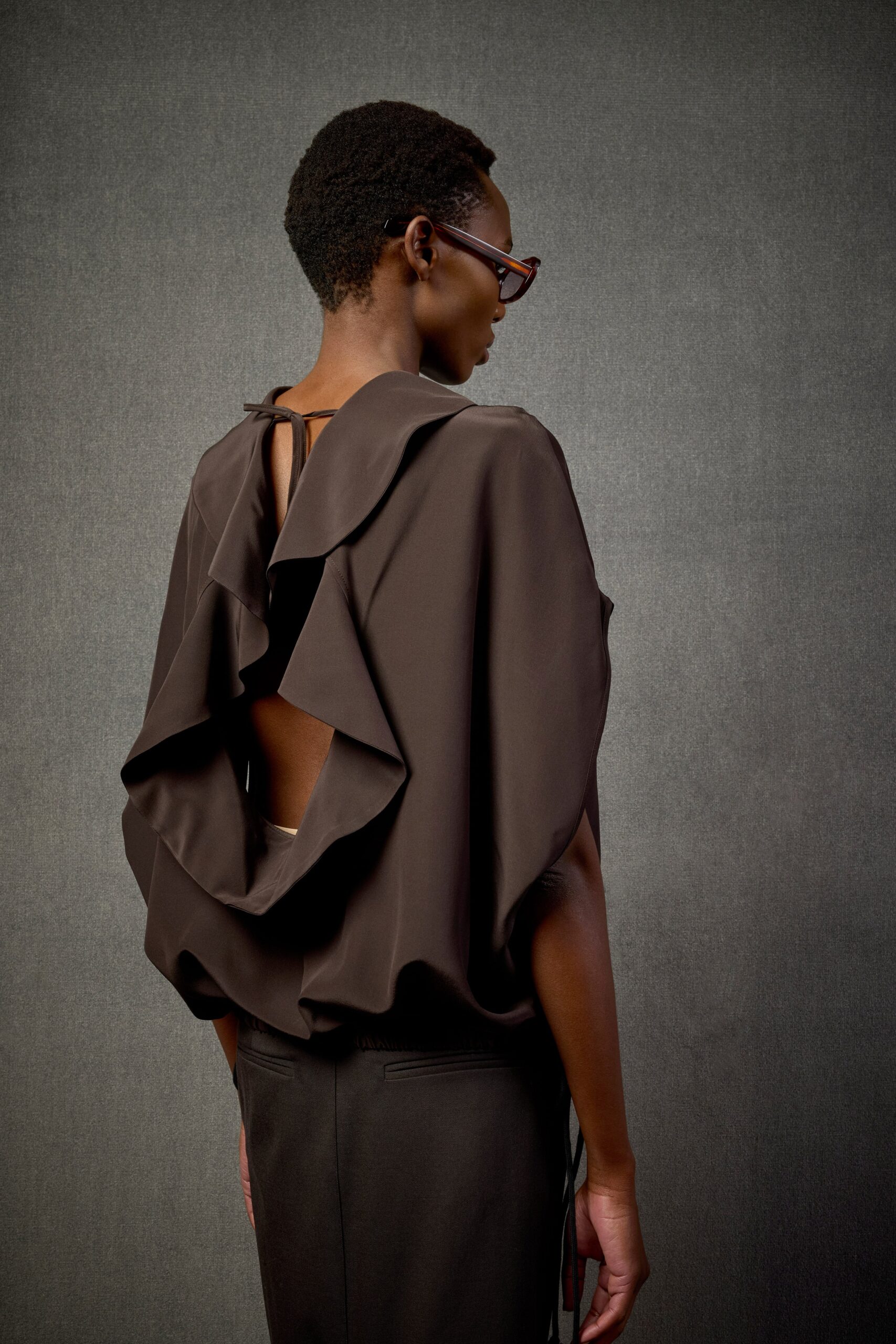 The Deva blouse is made in luxurious 100% silk. The elegant front features a collar that continues as a ruffle on the back, leaving it the open for a risque twist. This top has a dropped shoulder and adjustable hem with drawstring allowing for versatility.