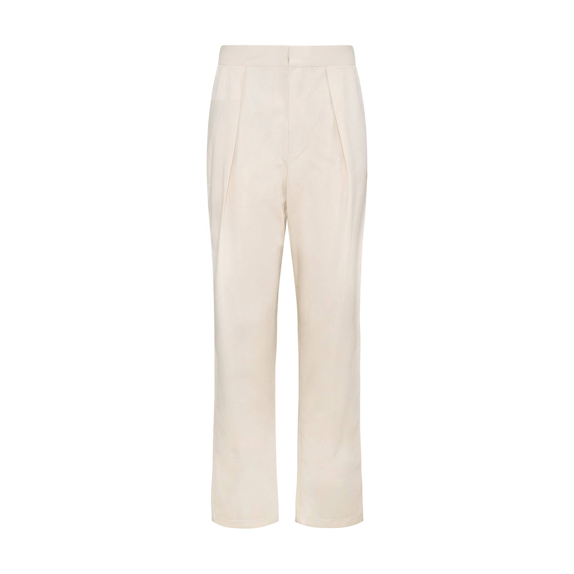 Sharpen up your wardrobe with these pleated ecru trousers crafted from organic-cotton twill in a tapered fit. An elasticated waistband allows for a comfortable fit. It features back welt pockets and slanted front pockets. Styling tip: pair with our crop tops for a fun look, or an elegant shirt for office attire.