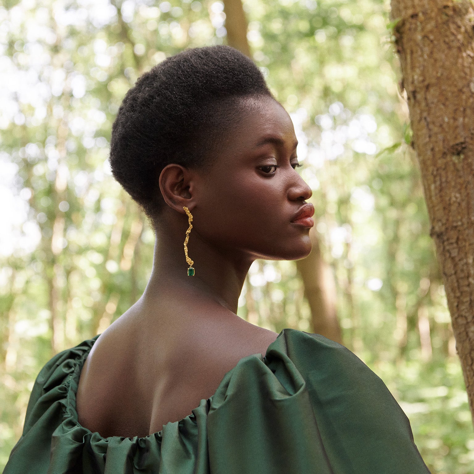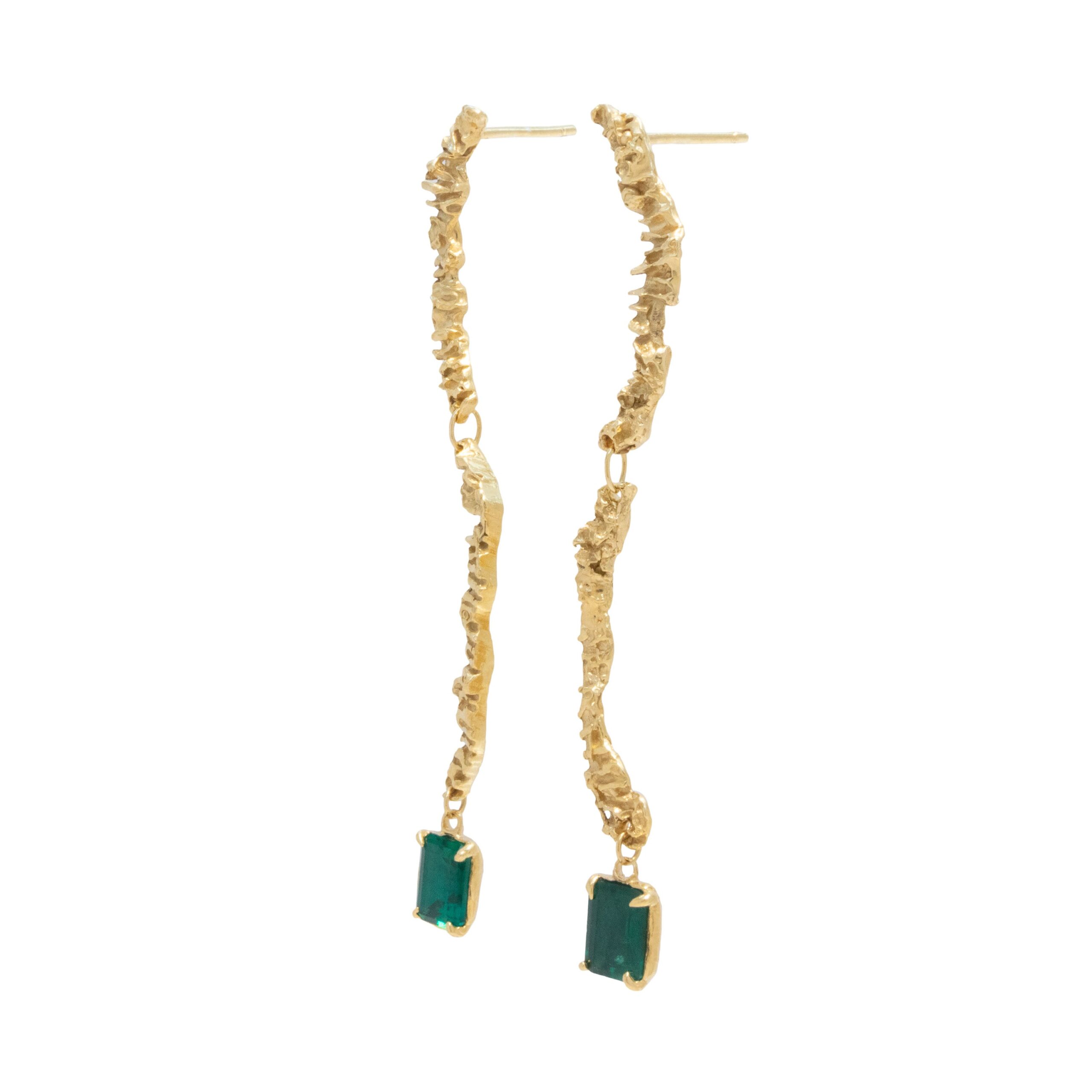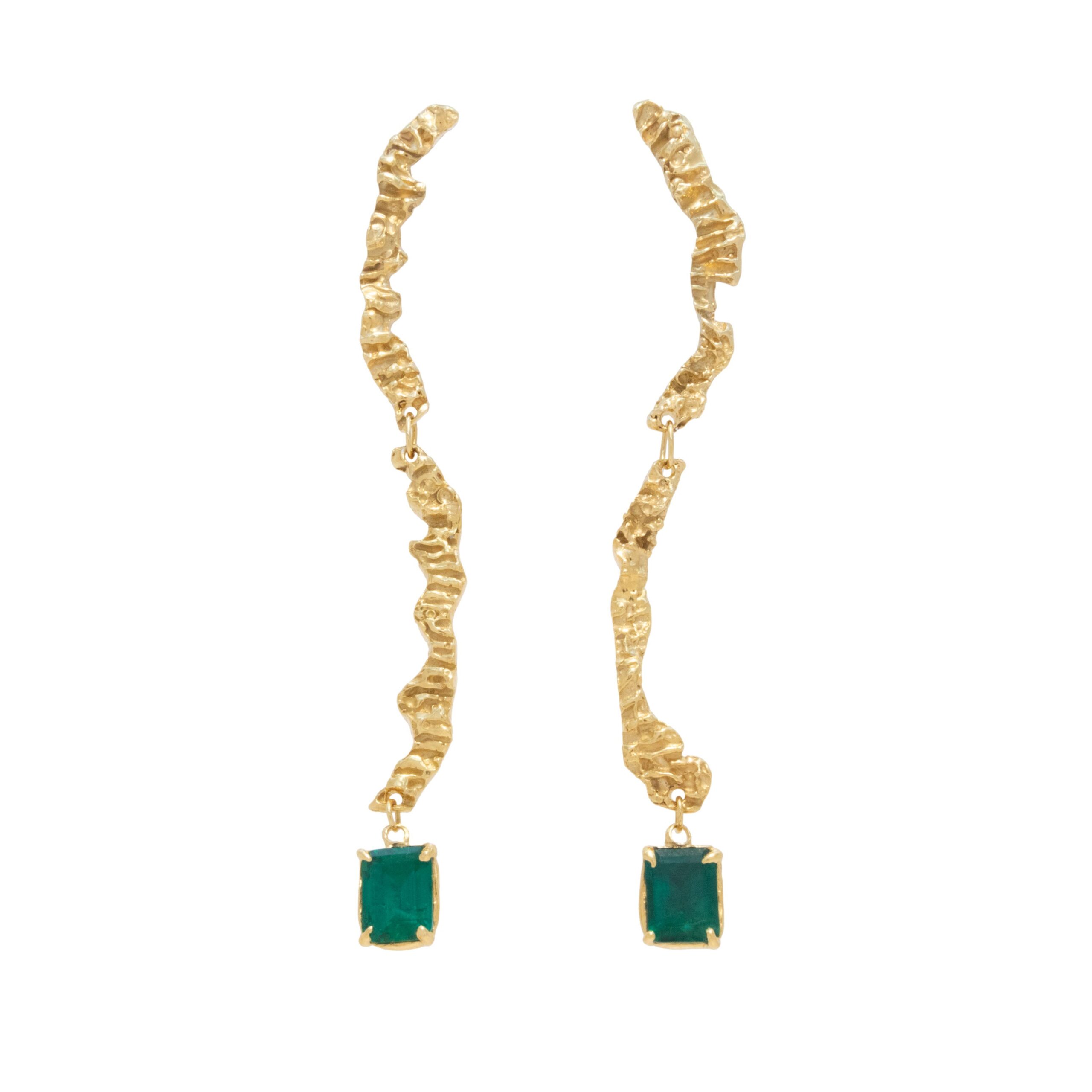 Enoki Emerald Earrings – The sinuous line element of these earrings, while abstract, create an elongated shape that enhances the neck and frames the face. The length of the earrings is balanced by the bold presence of the emerald drop, offering a stylish equilibrium. Its facets reflect light brilliantly, creating an entrancing interplay of colour.