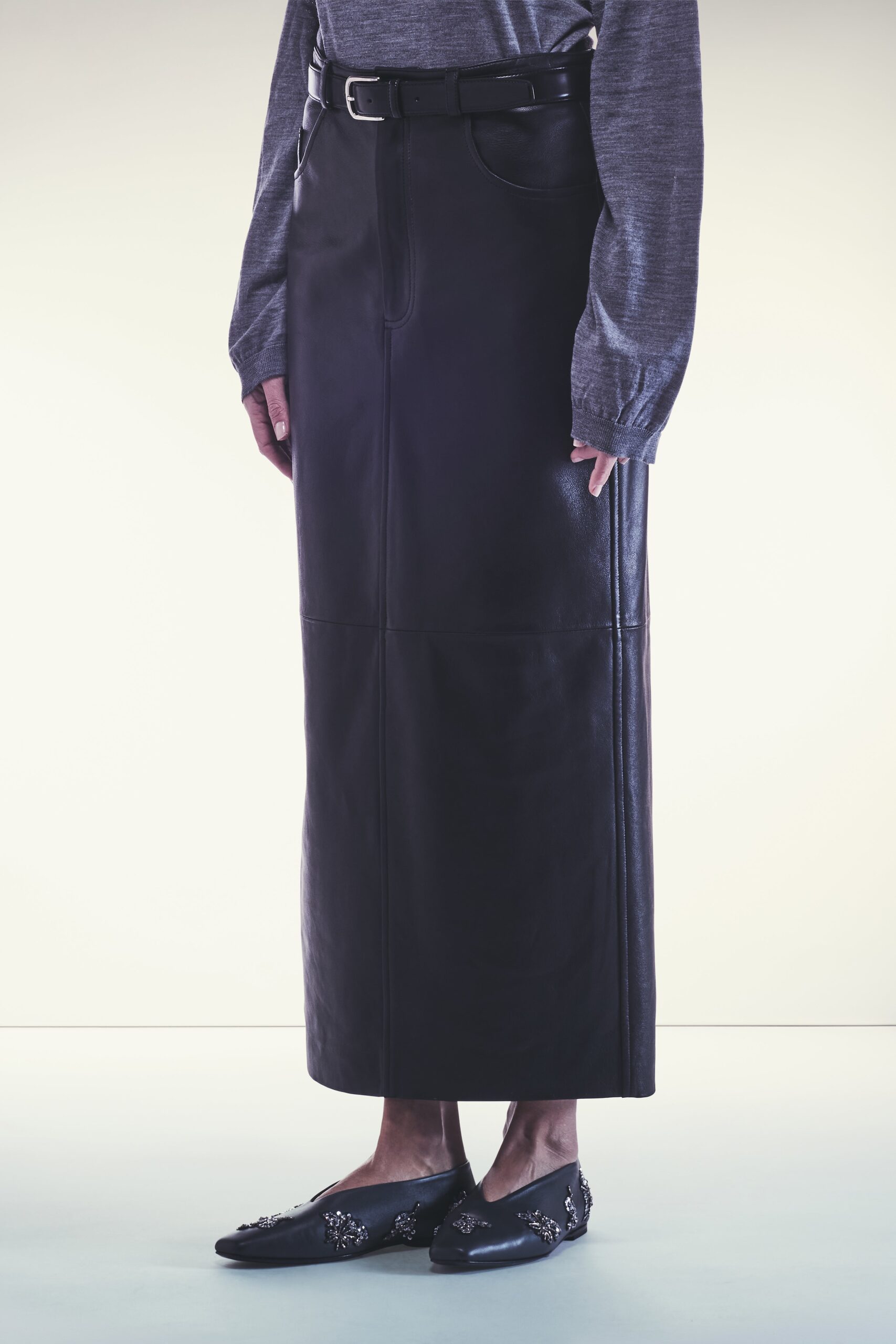 Long skirt in black stretch leather, with a clean line and back slit. Contemporary and versatile design for a snug and comfortable fit.
