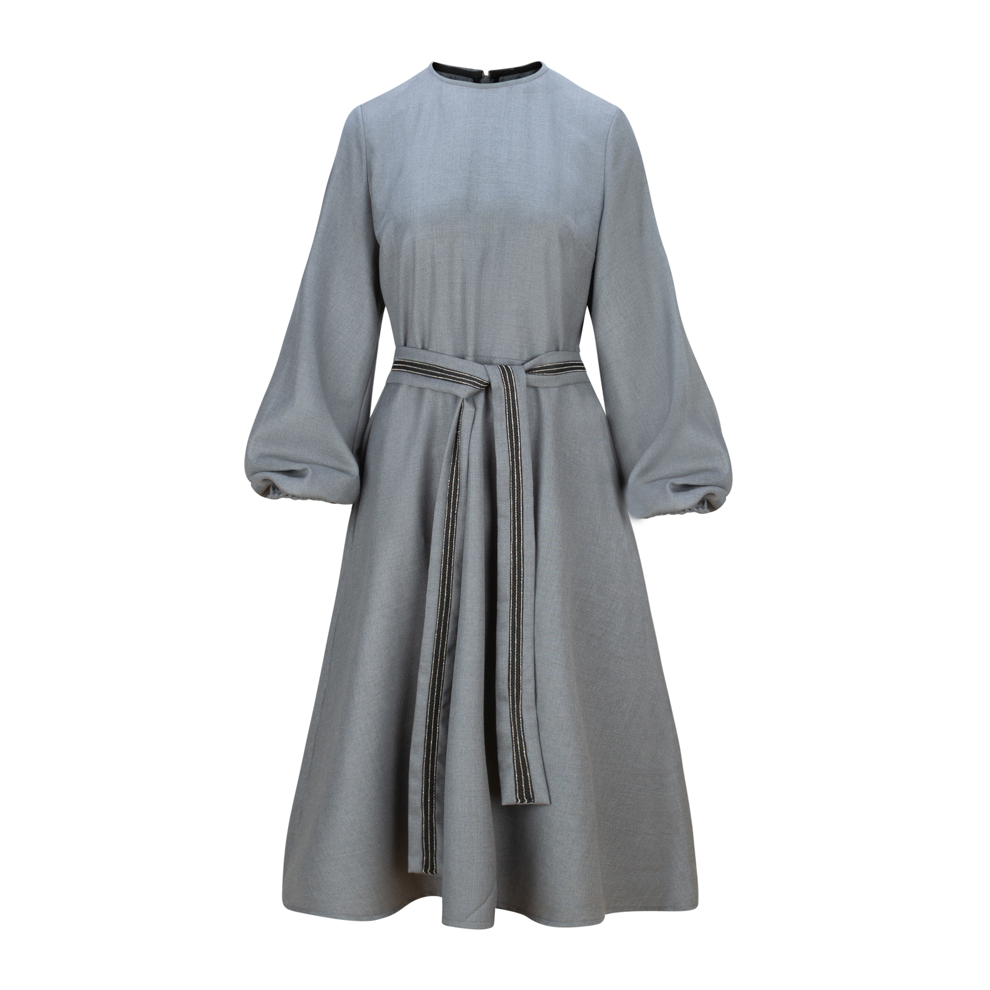 From fun to elegance, this lightweight dress is your reliable ally. The midi grey dressfitted at the waistline, with a flairing skirt comes with wide sleeves finished with an elasticated hemline.The embelished belt adds a sophisticated look. Styling tip: Wear with sneakers/sandals for a daytime chic or withheels for evening attire.