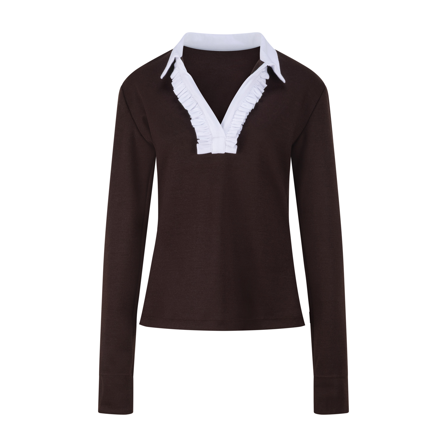 Our hot chocolate polo shirt is crafted from the softest merino wool jersey for luxurious comfort and a refined fit. Featuring a crisp white cotton button band with delicate frills and inner cuffs that reveal a bright contrast when turned up, it offers a feminine take on a classic silhouette. Elegant yet effortless, it is a versatile addition to the modern wardrobe.