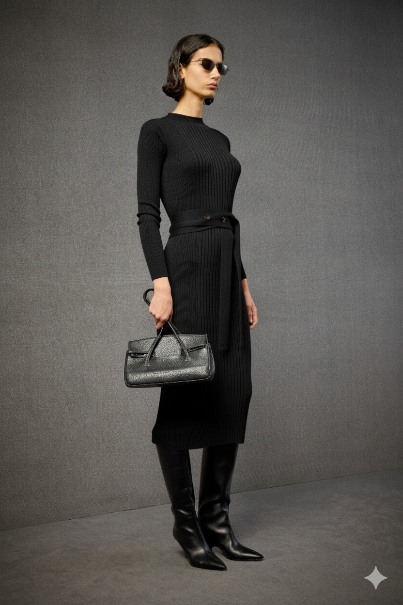 The Indira black knit dress is fitted for a classic look. Made in extra-fine black merino wool with long sleeves and a centre slit at the back. The matching belt has a unique button closure for that special touch.