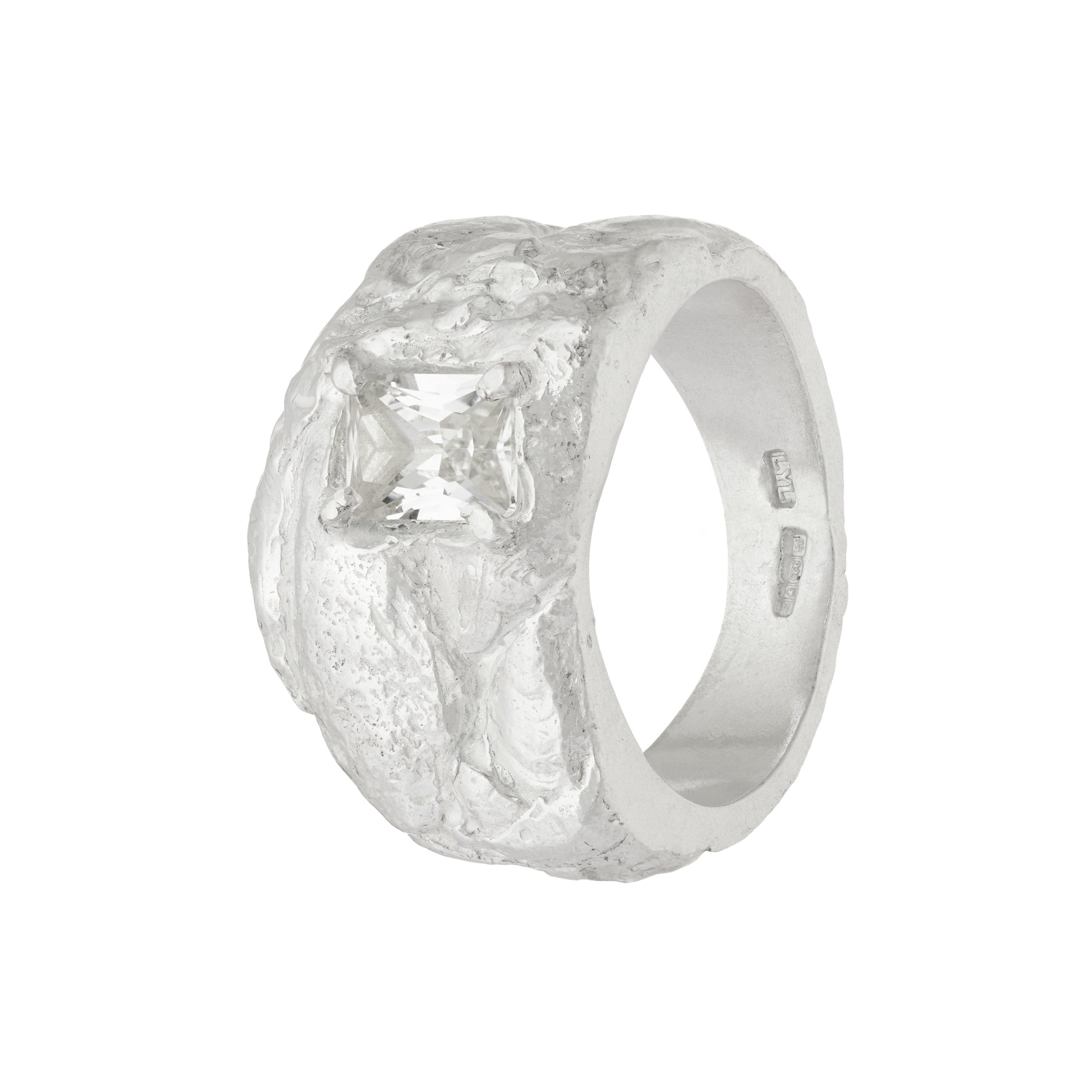 Kai White Sapphire Argenti Ring – A bold and captivating piece that stands out with its striking design. At the centre of this ring is a large, baguette-shaped lab-grown white sapphire, offering a brilliant clarity that catches and reflects light from every angle. The cool tone of sterling silver perfectly complements the clear gemstone, enhancing its radiance and making it the focal point of the design.The ring’s band is intricately detailed with textures inspired by goose barnacle shells, adding a unique, organic feel to the piece.