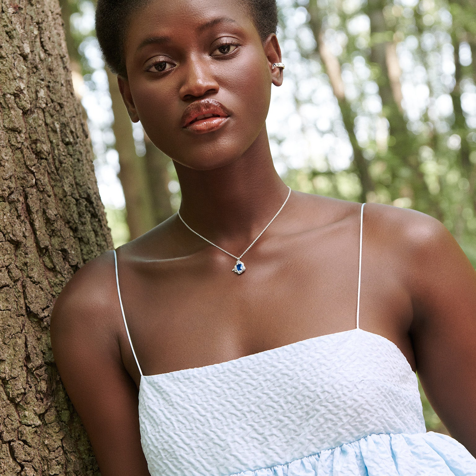 Leana Sapphire Argenti Necklace – At the heart of this textured drop necklace lies a magnificent lab-grown sapphire. The pendant’s abstract design and nature-inspired elements make it a cherished accessory that adds elegance and charm to any outfit.