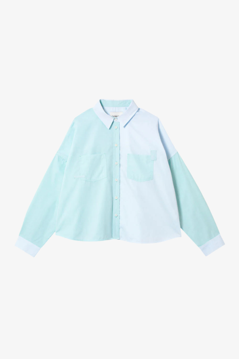 A modern take on a classic reimagined, this pastel green and blue Lela is a play on contrasts and colour. Cut from soft, crisp cotton and crafted in the UK, the colourblock design brings fresh energy to the boxy silhouette. Signature patch pockets complete the look.