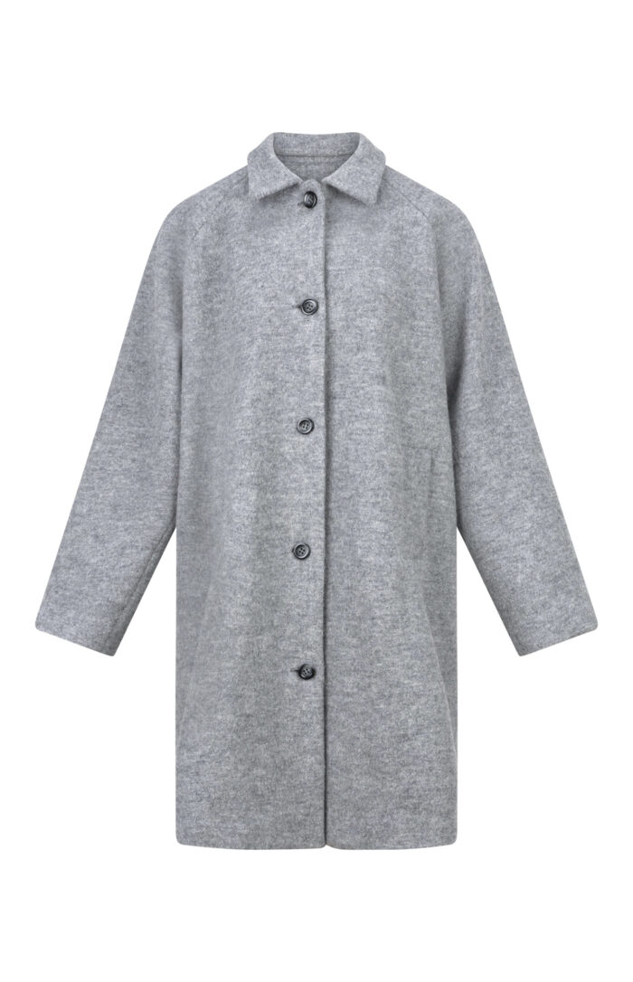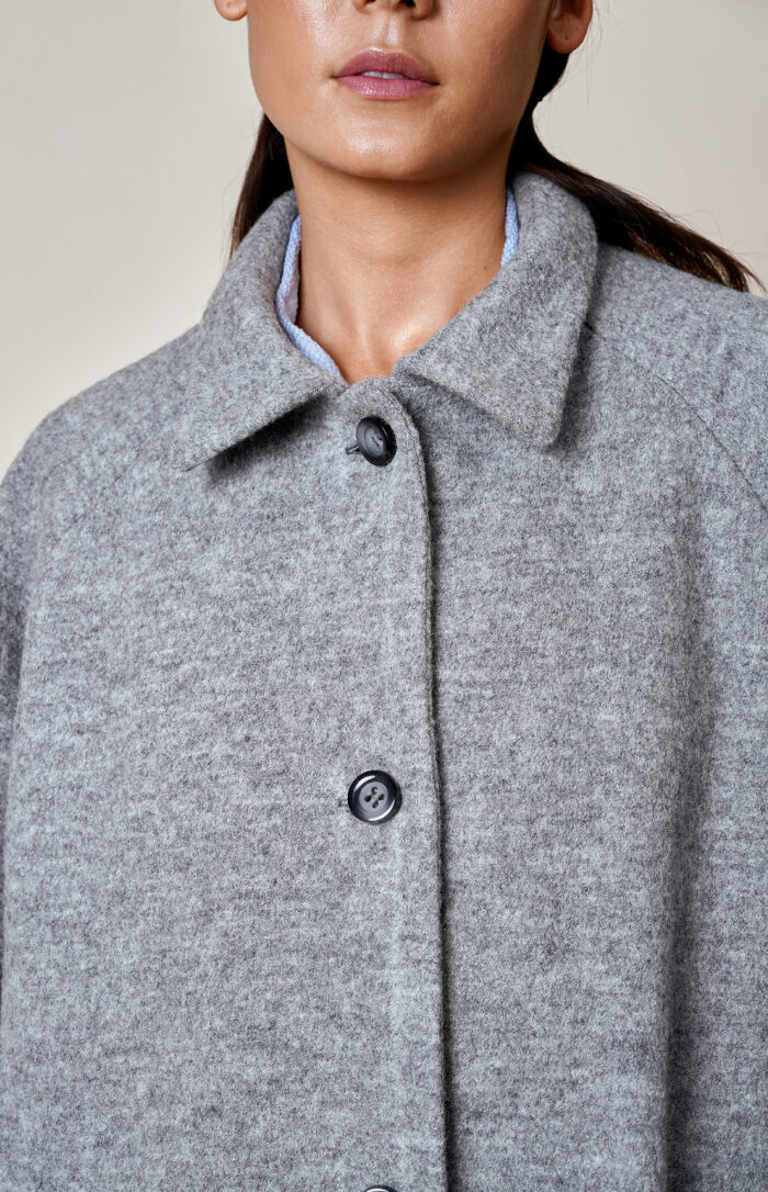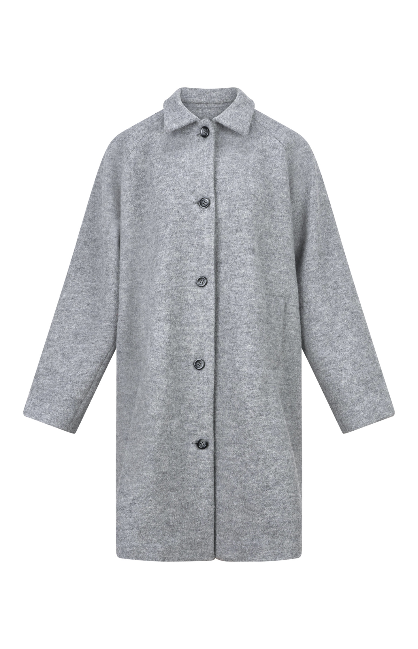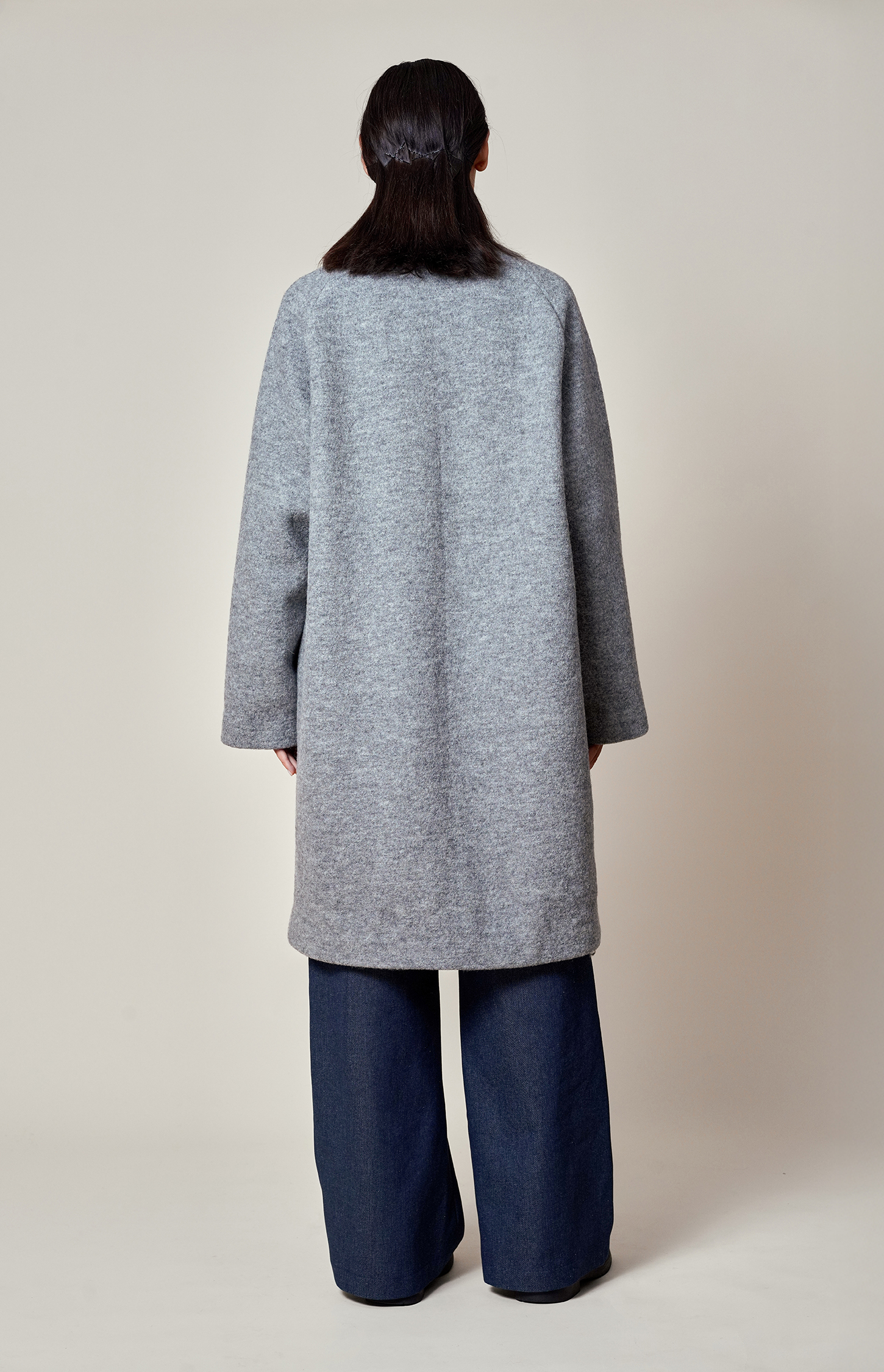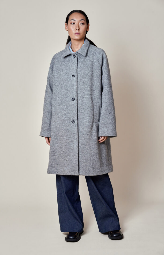 Our light grey felted wool coat is a modern reinterpretation of the classic menswear overcoat, crafted with precision and care. Designed with raglan sleeves for softly rounded shoulders and slanted pockets lined in soft viscose, it balances structured tailoring with effortless ease.