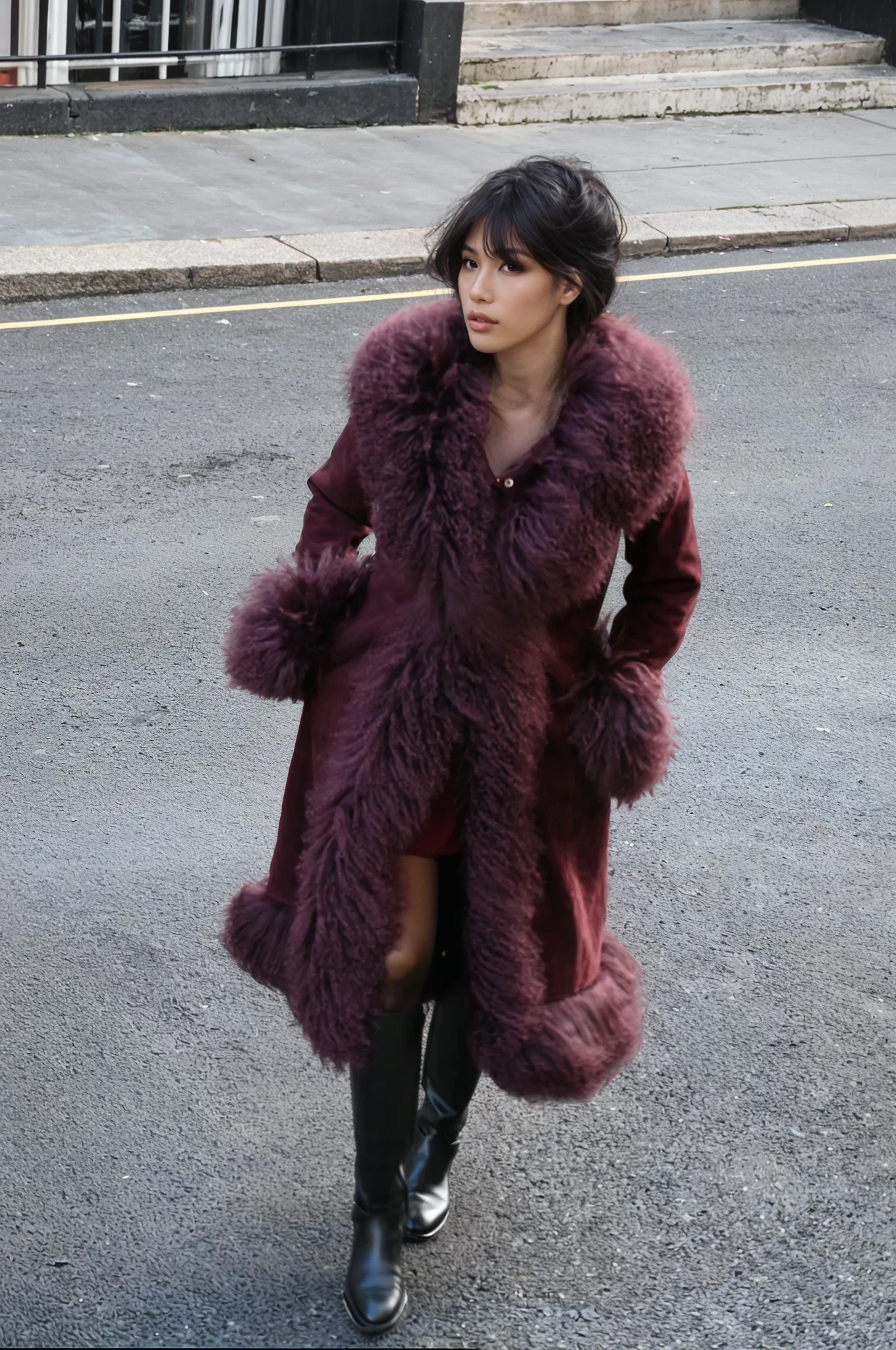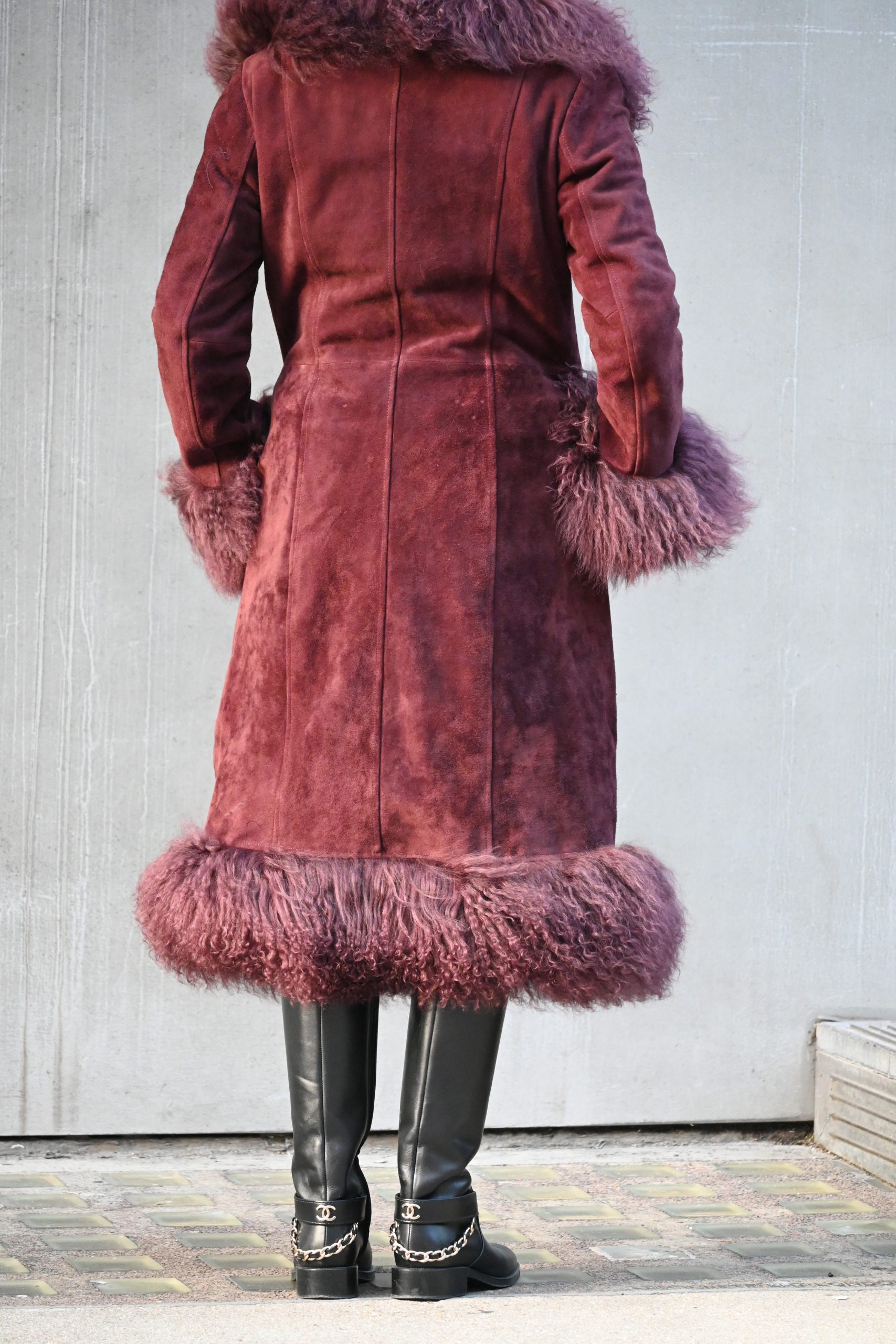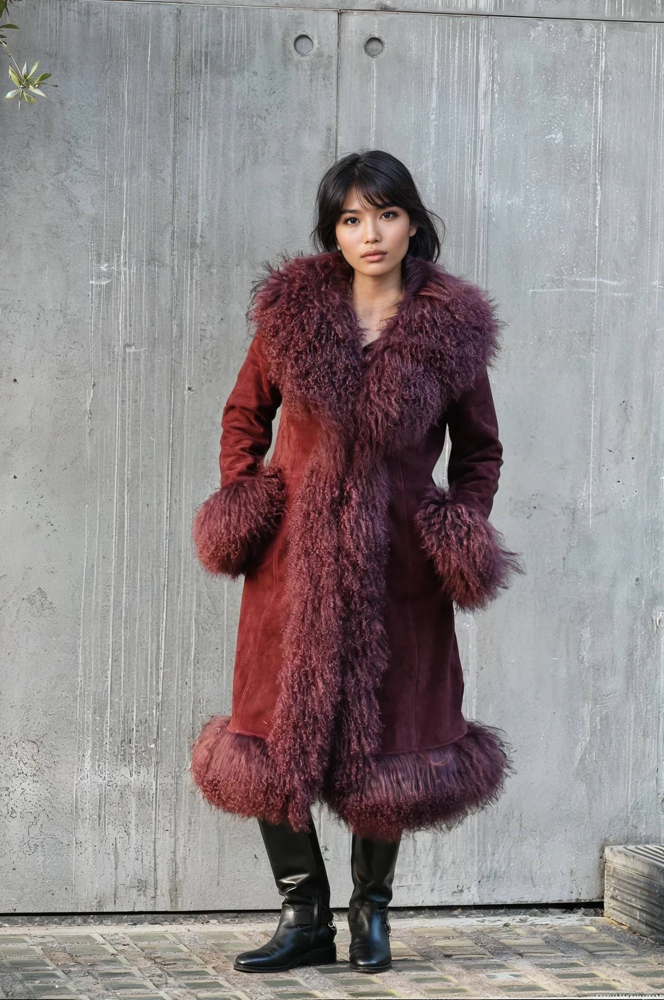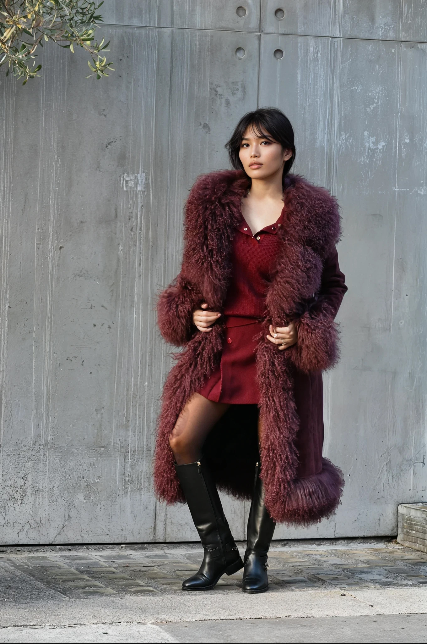 Lili Burgundy Fur Coat, lavishly trimmed with plush Mongolian fur. Its longline silhouette and rich texture create a striking balance of sophistication and warmth. Designed to elevate any winter look, this statement piece exudes timeless elegance and effortless glamour.