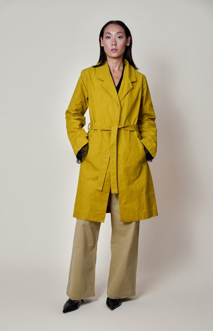 This lime belted raincoat, crafted from organic waxed cotton, is meticulously designed for a functional yet stylish look. It features a classic lapel, slanted pockets, and a just-under-the-knee length. The inside edges are meticulously finished with black cotton binding, showcasing exceptional craftsmanship and attention to detail. This versatile raincoat is practical for any weather and can be easily maintained with a damp cloth or rewaxed for lasting durability.