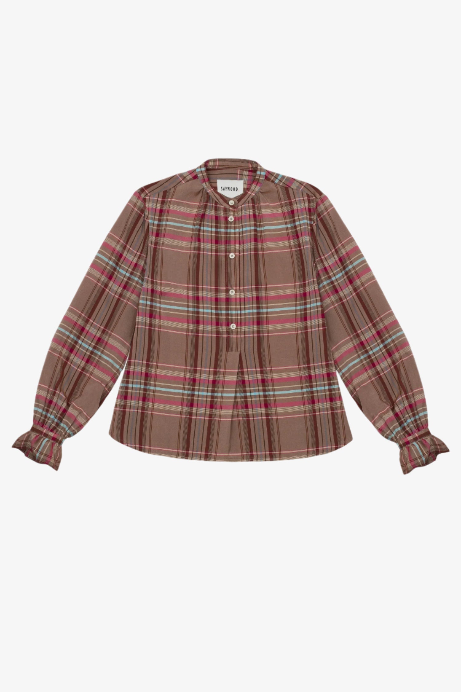 Limited edition Marie A-line blouse in pink and hazelnut check surplus fabric with gathered neck and cuffs by Saywood