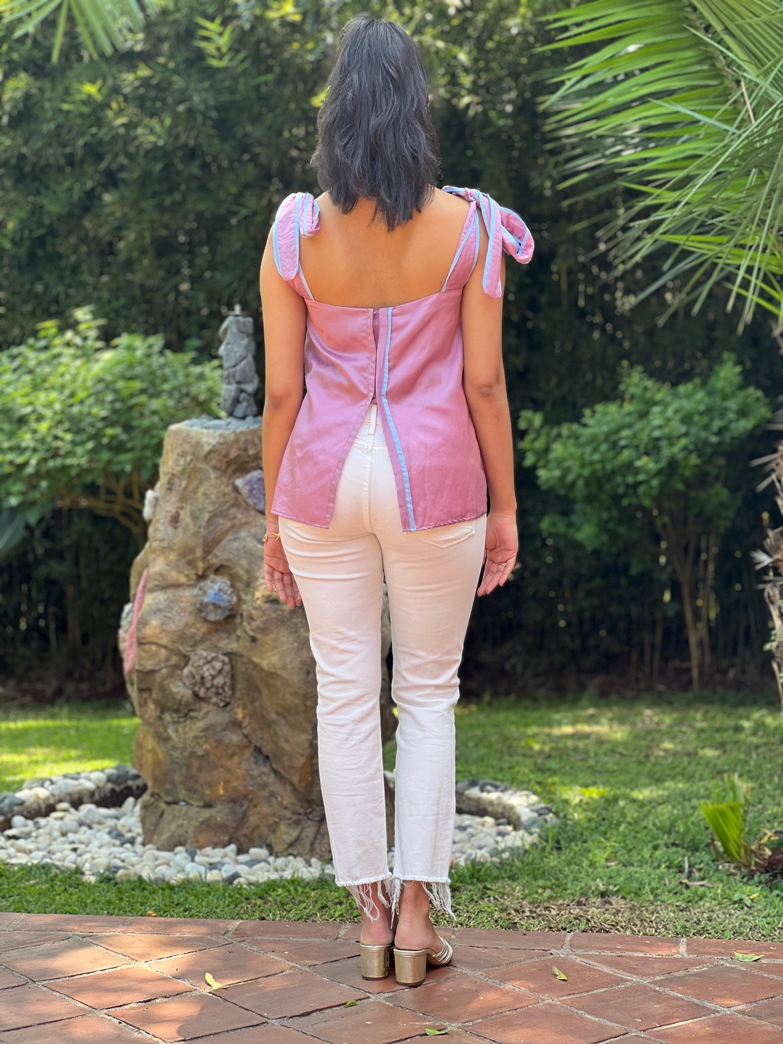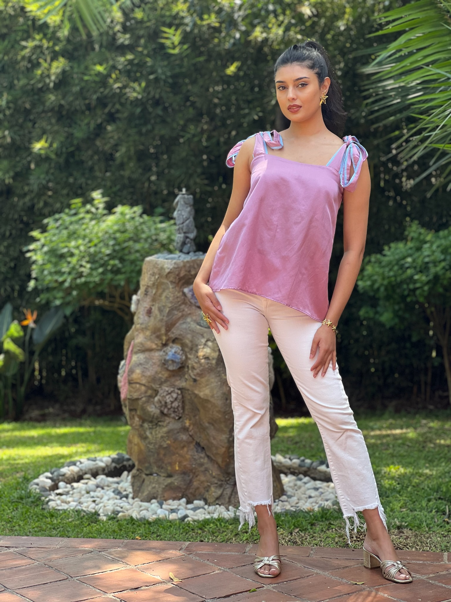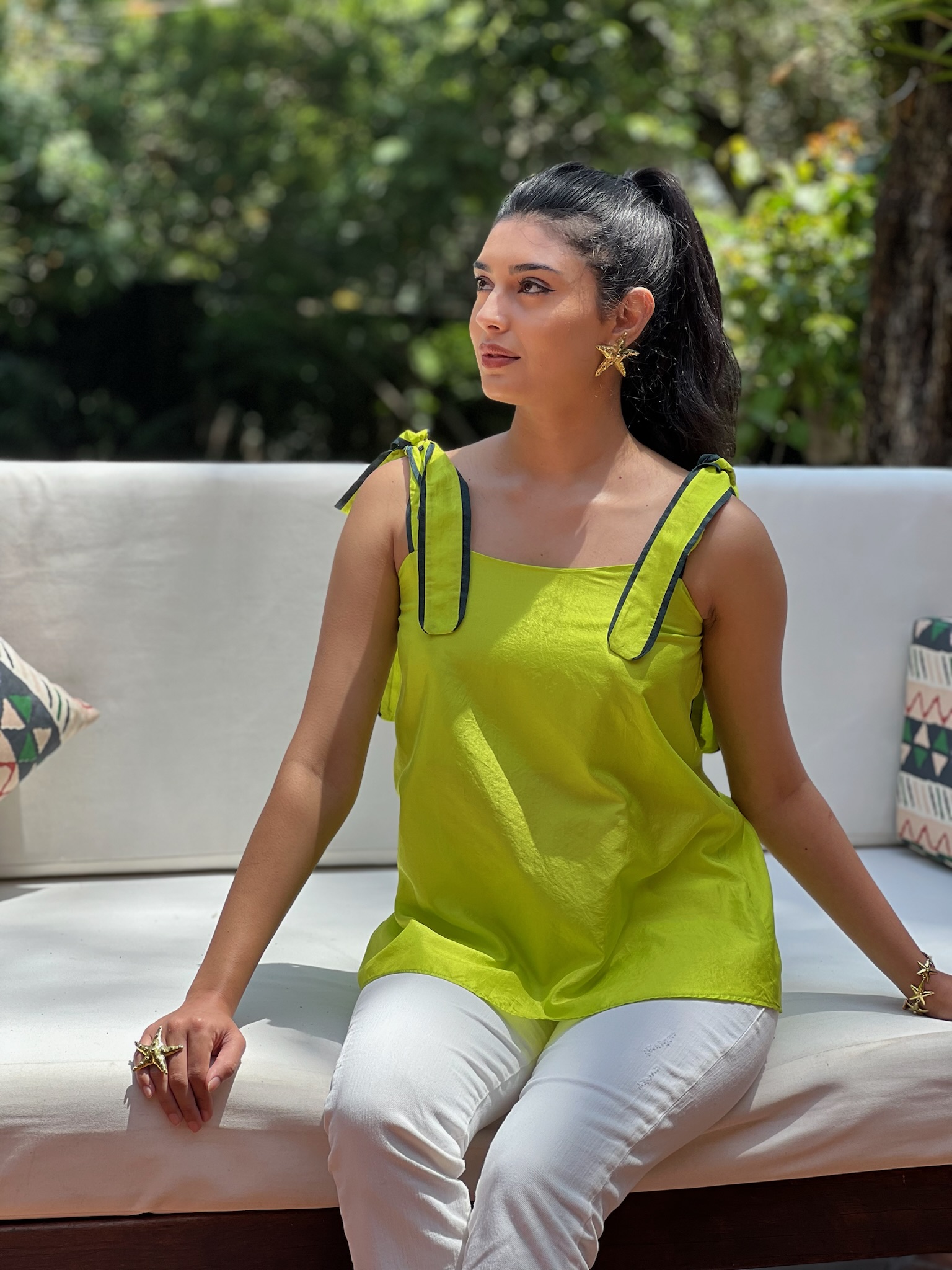Another wardrobe staple is our Shanzu camisole style top. But we like to be a little bit fabulous wherever we can be, so the added detail on the tie up straps and the slight slit at the back promise a bit more heat than the ordinary camisole.