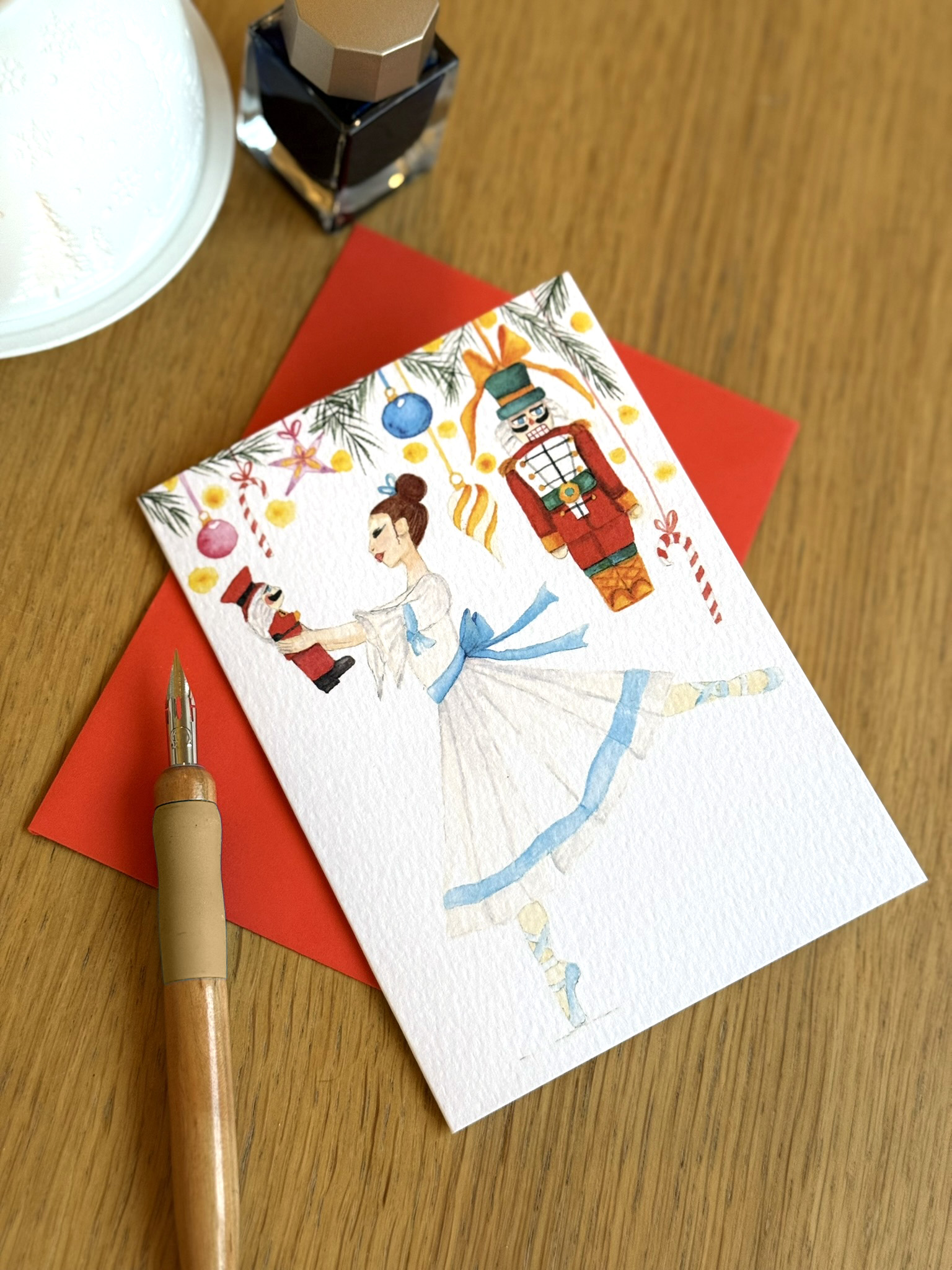 This enchanting, hand illustrated, Christmas card captures a magical ballet scene from The Nutcracker. The main character, poised in mid-dance, twirls gracefully with a delicate puppet in hand, bringing the story to life. Set against a festive backdrop of shimmering Christmas decorations, a nutcracker puppet stands proudly nearby, adding to the holiday spirit. The elegant choreography and whimsical setting evoke the charm and wonder of this classic Christmas tale, filling your heart with joy and the magic of the season.
