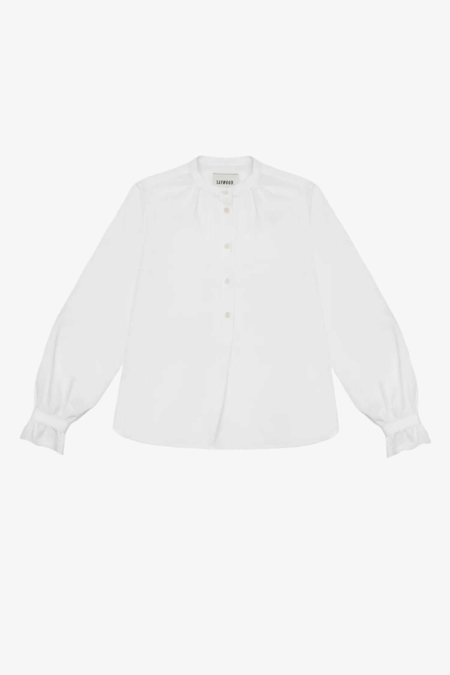 Marie A-line blouse in white recycled cotton with gathered neck, lace-trimmed cuffs, made in London by Saywood