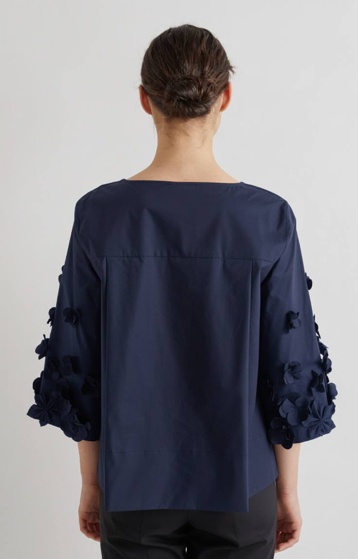 Step into effortless elegance with this navy cotton top, designed to flatter and delight. Made from 100% cotton, it features a graceful scoop neckline and elbow-length sleeves adorned with delicate navy fabric flowers, adding a subtle touch of 3D floral charm.