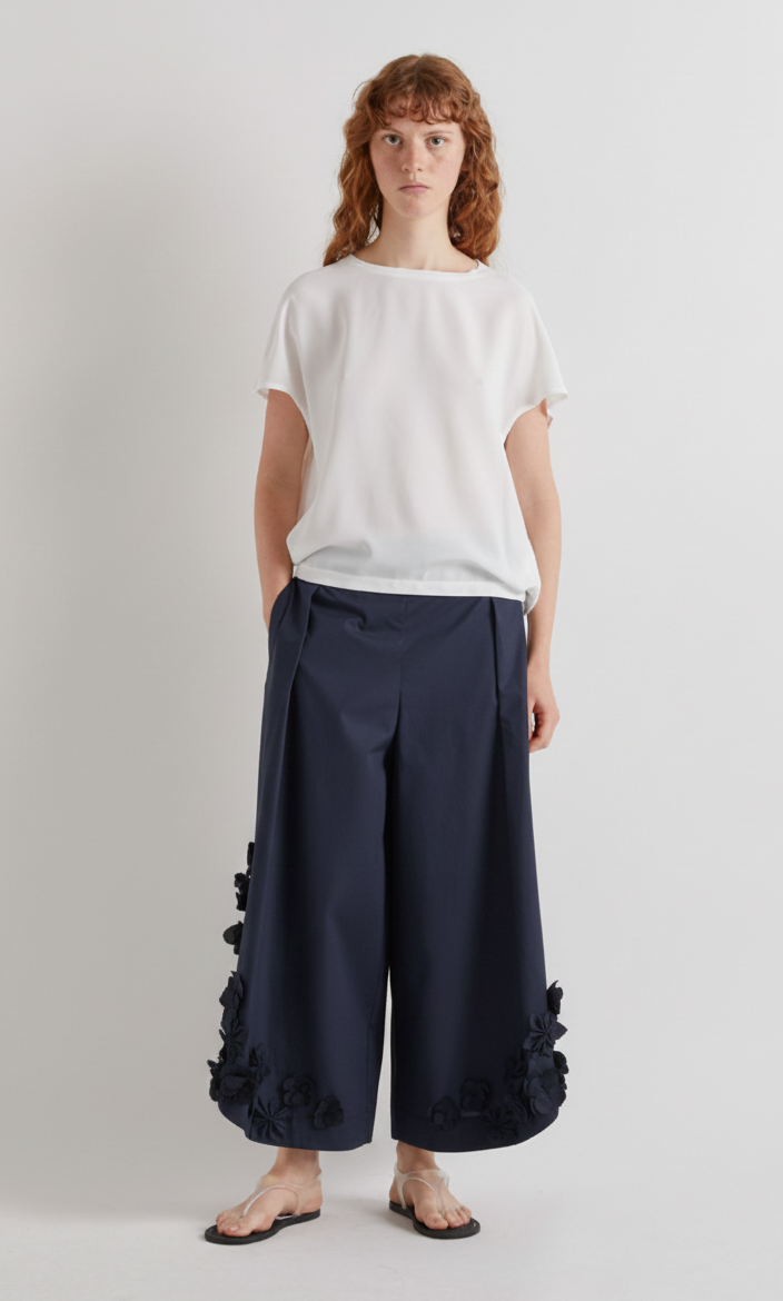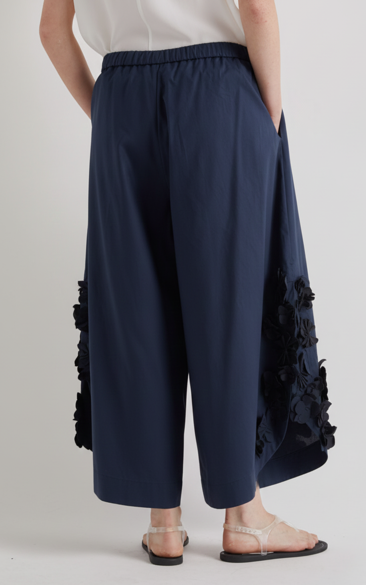 These flattering navy cotton trousers are beautifully made in Italy from 100% cotton. They feature a graceful curved bottom leg split adorned with delicate navy fabric flowers, adding a subtle touch of 3D floral charm.