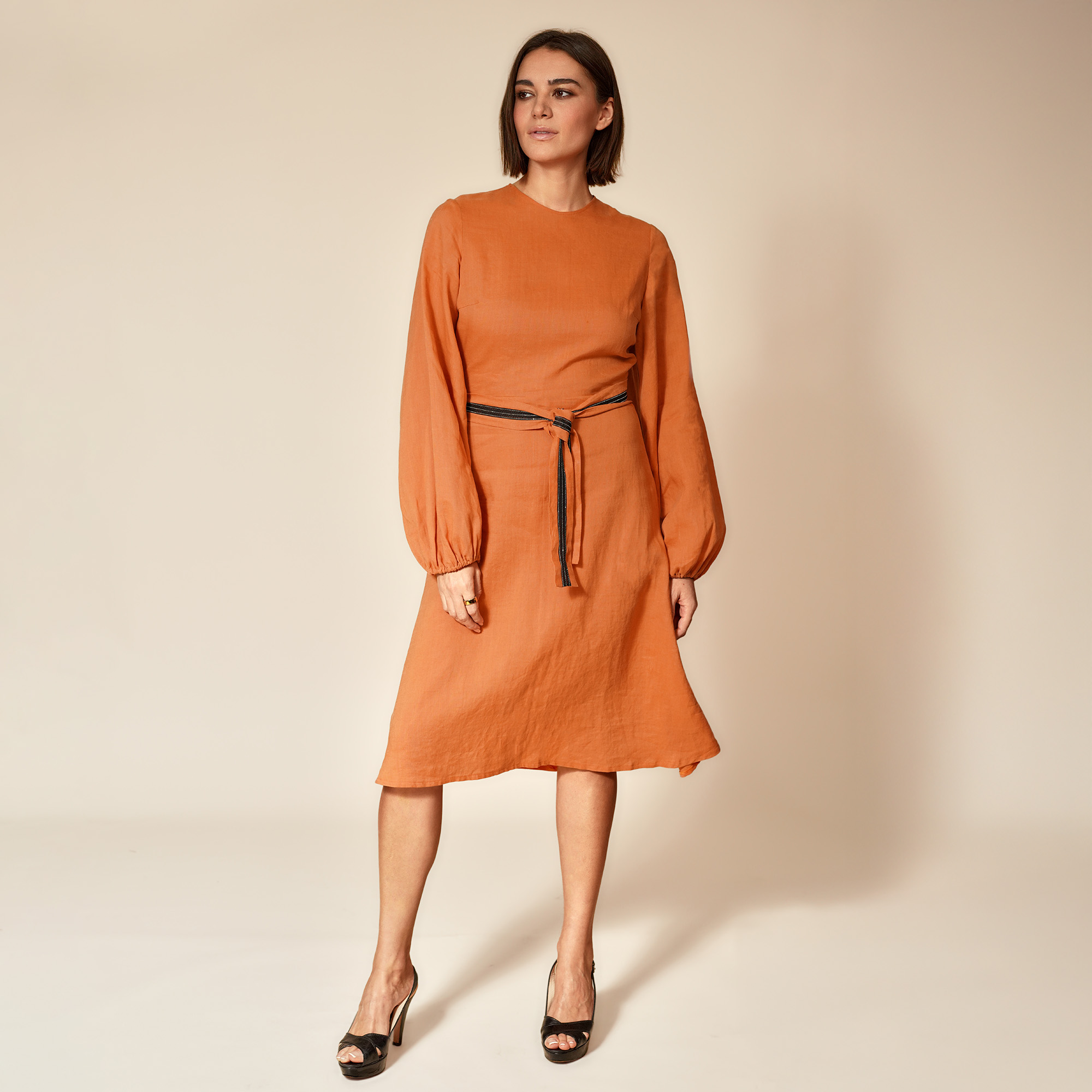 Introducing our Orange Belted Long Sleeve Dress made of a soft draping cotton viscose blend , a versatile piece perfect for transitioning from the office to a social outing.