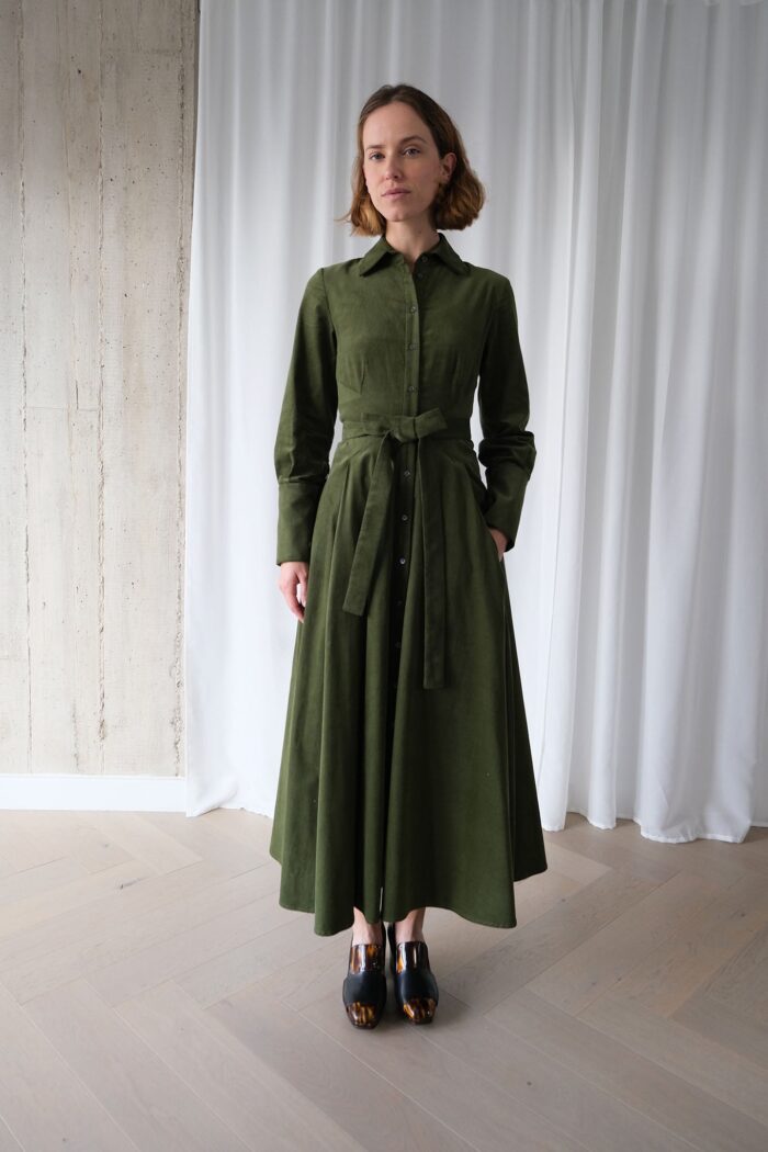 This Romanticist dress in a beautiful olive shade of mid-weight cotton needlecord from a local British supplier. The dress comes with a belt attached at the back – for a relaxed look, tie the belt at the back or else wrap it around to the front to cinch in the waist.