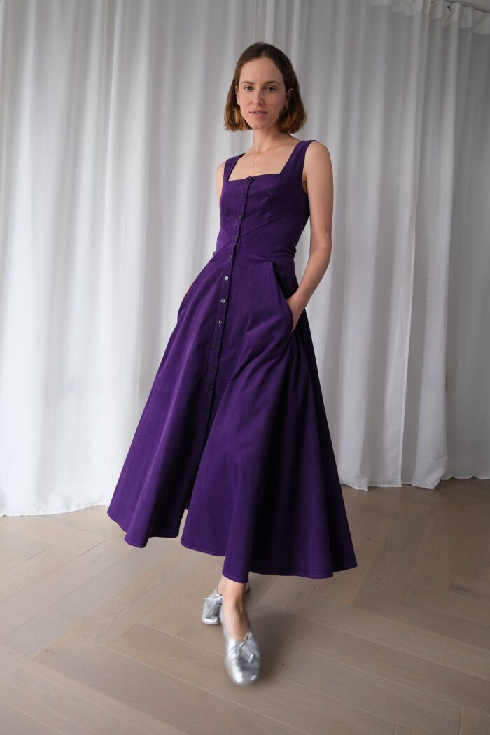A beautiful variation of our bestseller Romanticist dress with a flattering square neckline in royal purple cotton needlecord. The dress comes with a belt attached at the back – for a relaxed look, tie the belt at the back or else wrap it around to the front to cinch in the waist.