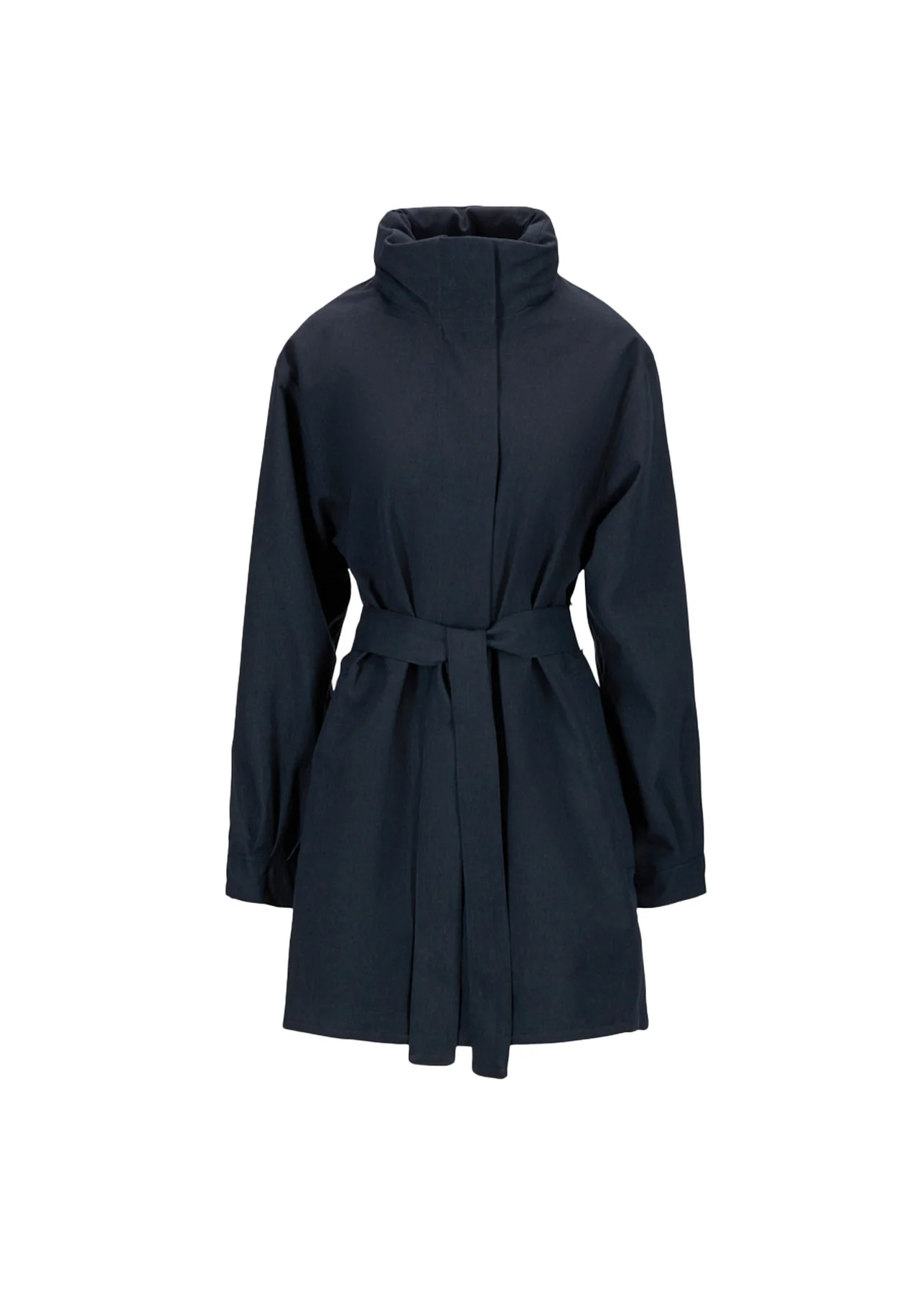 Rossby Coat in the color Dark Navy, is a feminine and waterproof rain jacket made from recycled fabric. The rain coat has balloon sleeves and belted waist, which makes your silhouette shine. Hidden hood in collar and both zip and magnetic closures.