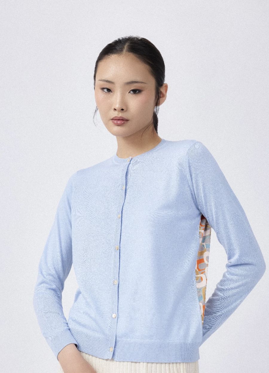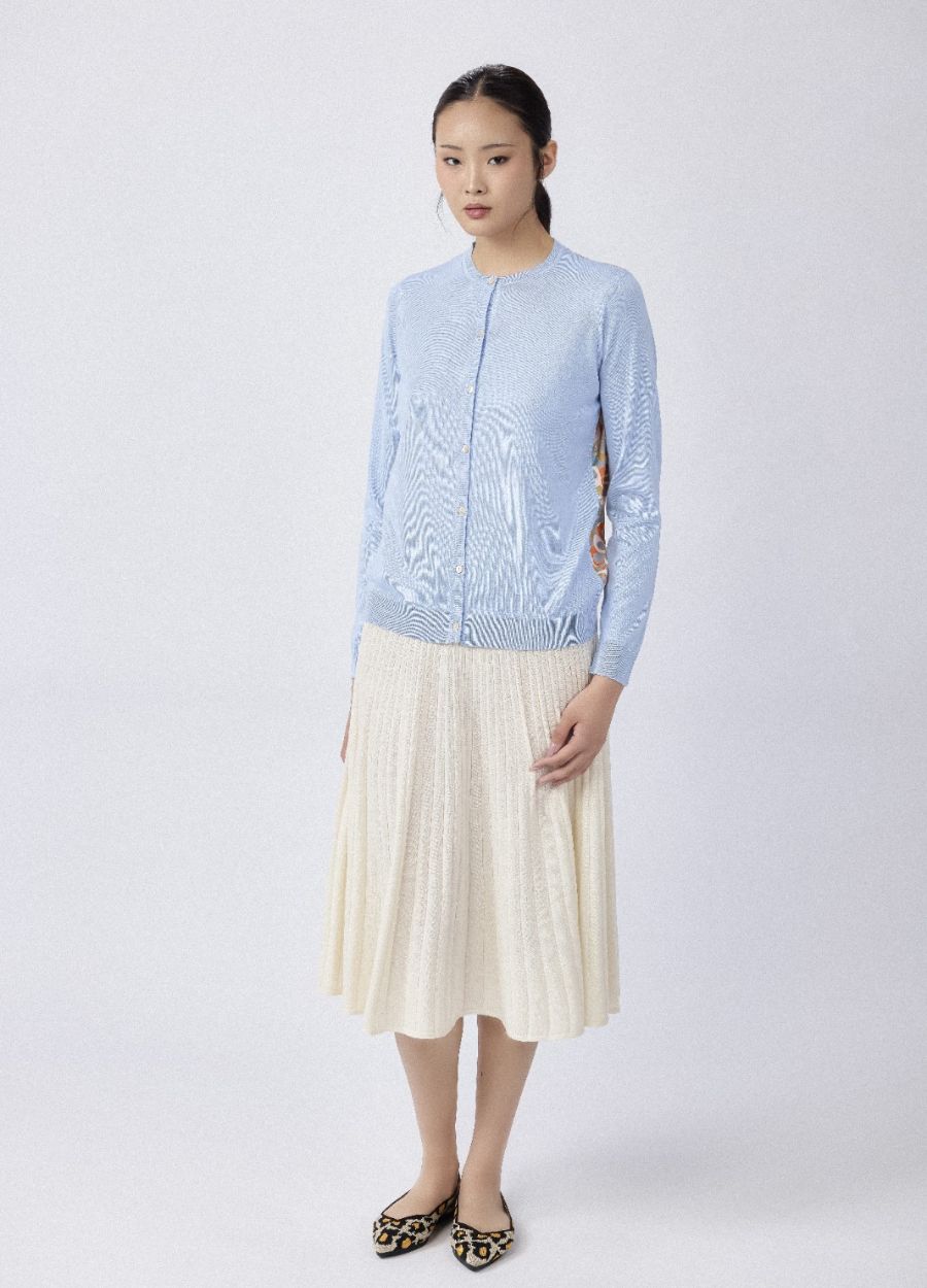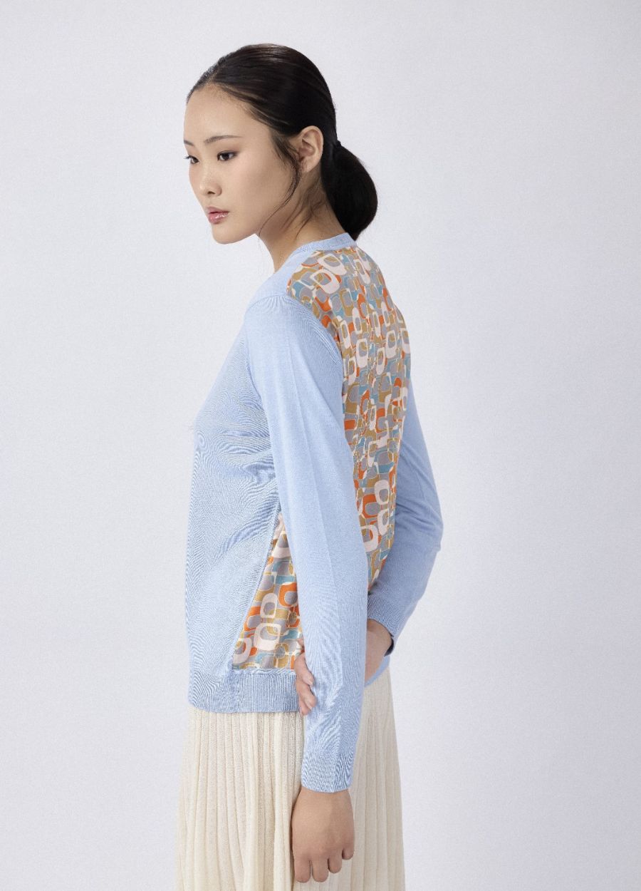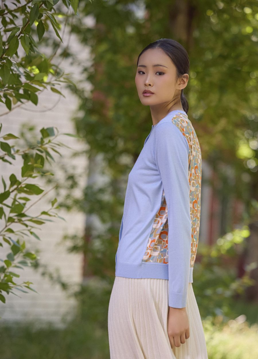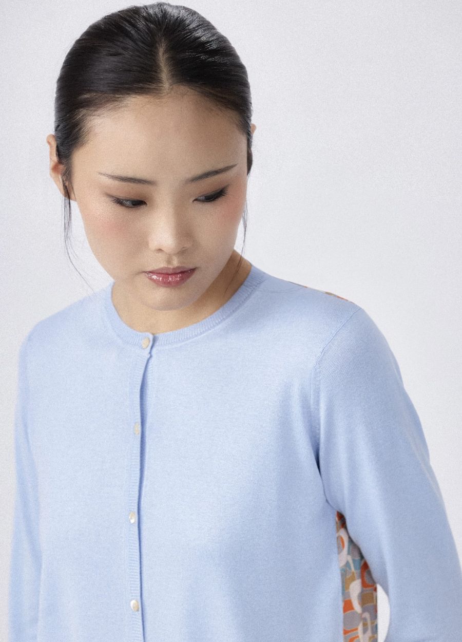 This crew neck knitted cardigan is crafted from a luxurious 15% cashmere and 85% silk blend, with a 100% printed silk back panel for added softness and smoothness. The 2-ply 16gg fine gauge knit ensures a light, cool feel, perfect for spring. With pastel colours and a retro print, this cardigan brings a charming vintage look to your wardrobe, ideal for embracing the season with a fresh, elegant touch.