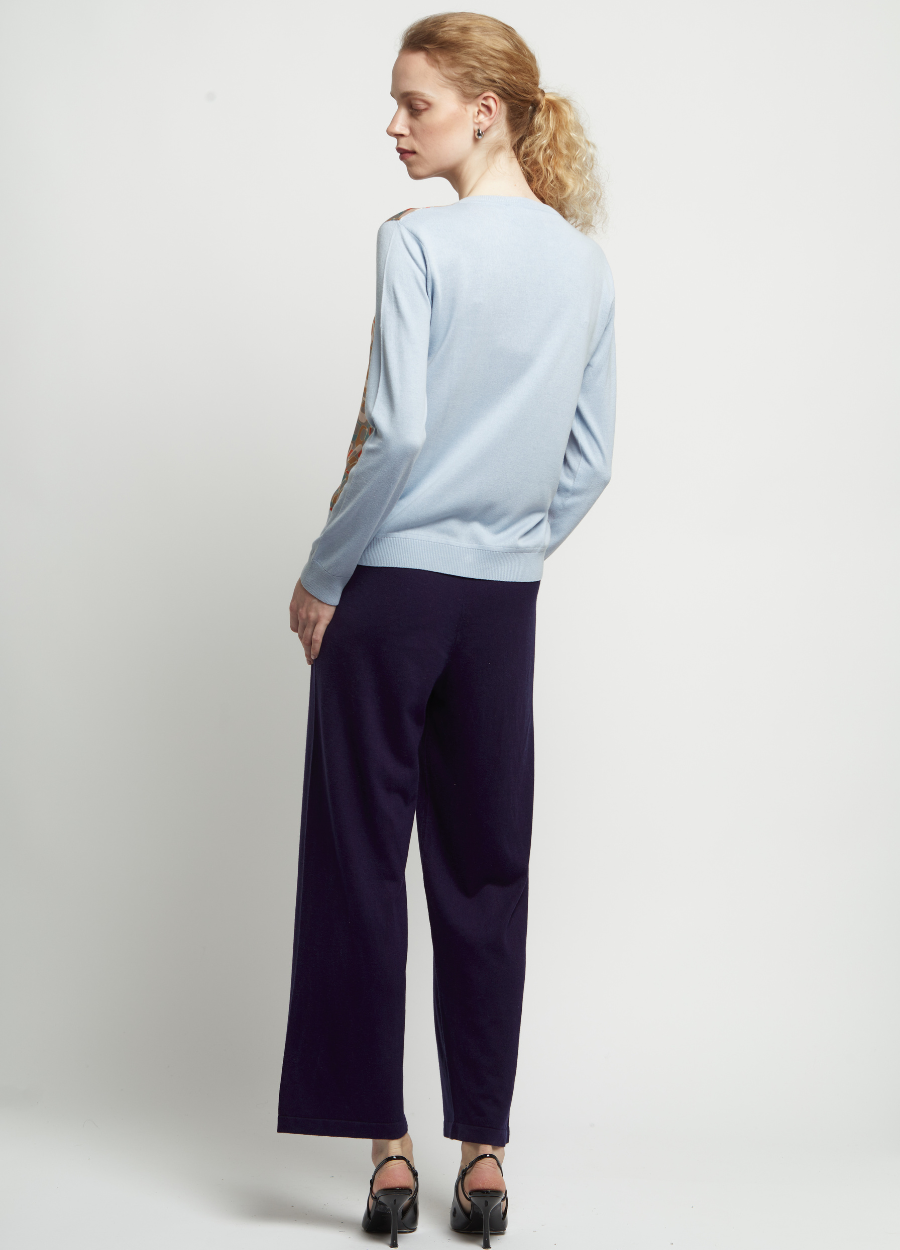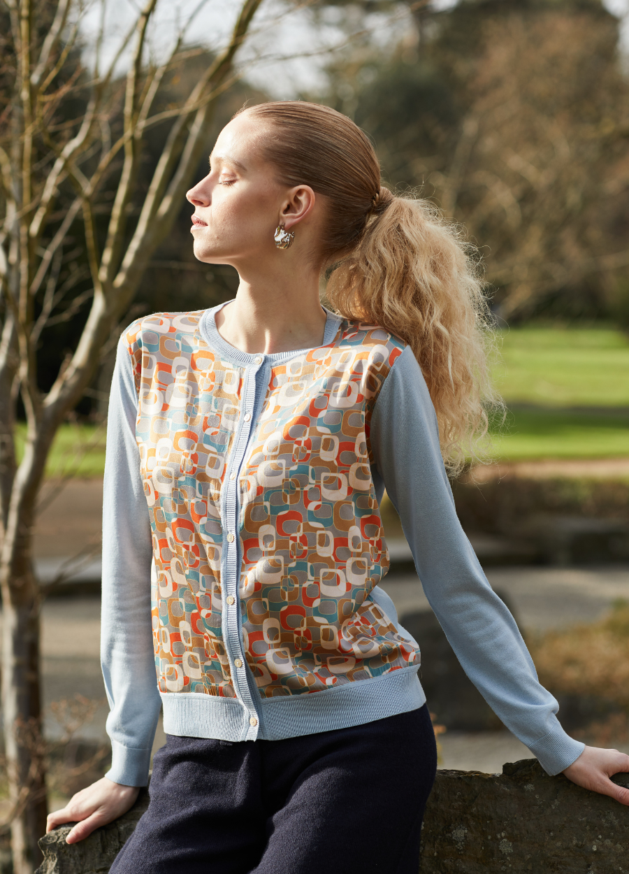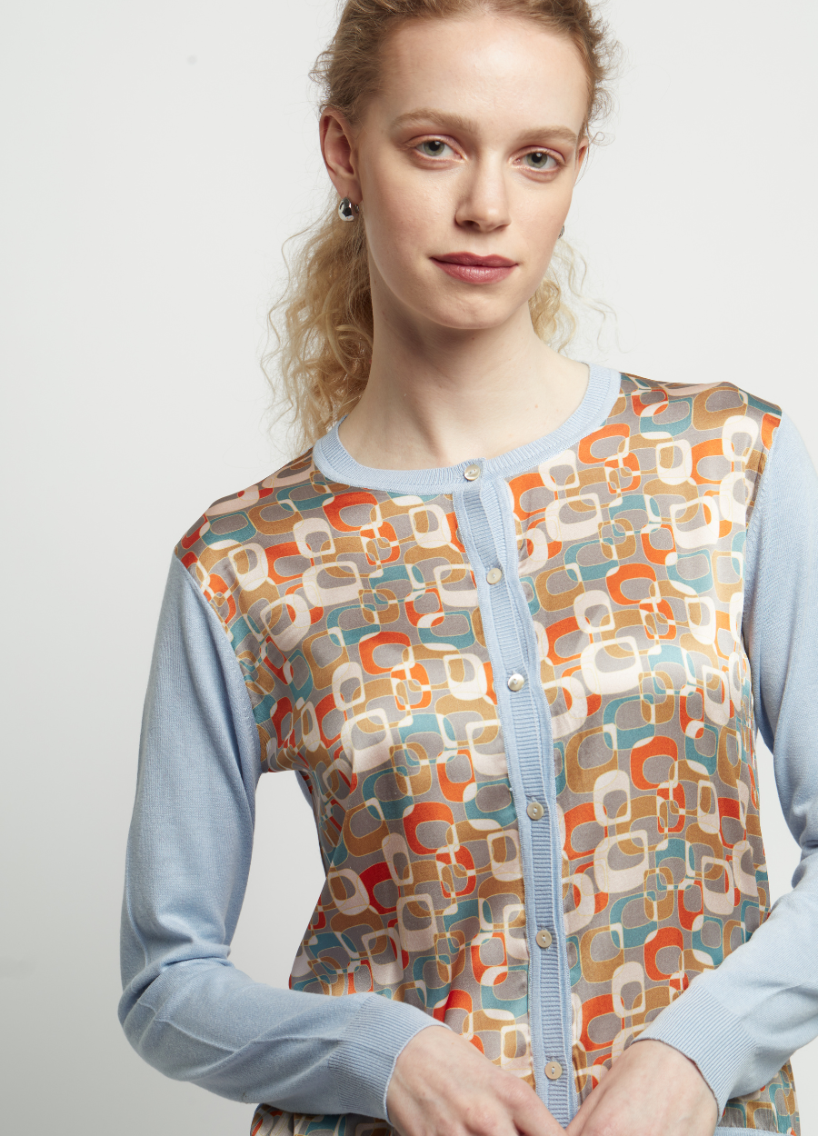 This crew neck knitted cardigan is made from a luxurious 15% cashmere and 85% silk blend, with 100% printed silk front panels, offering a soft and smooth feel. The 2-ply 16gg fine gauge knit provides a light, cool texture, ideal for layering in spring. Featuring pastel colours and a retro print, this cardigan adds a lovely vintage touch to your wardrobe, perfect for embracing the season’s fresh and stylish vibe.