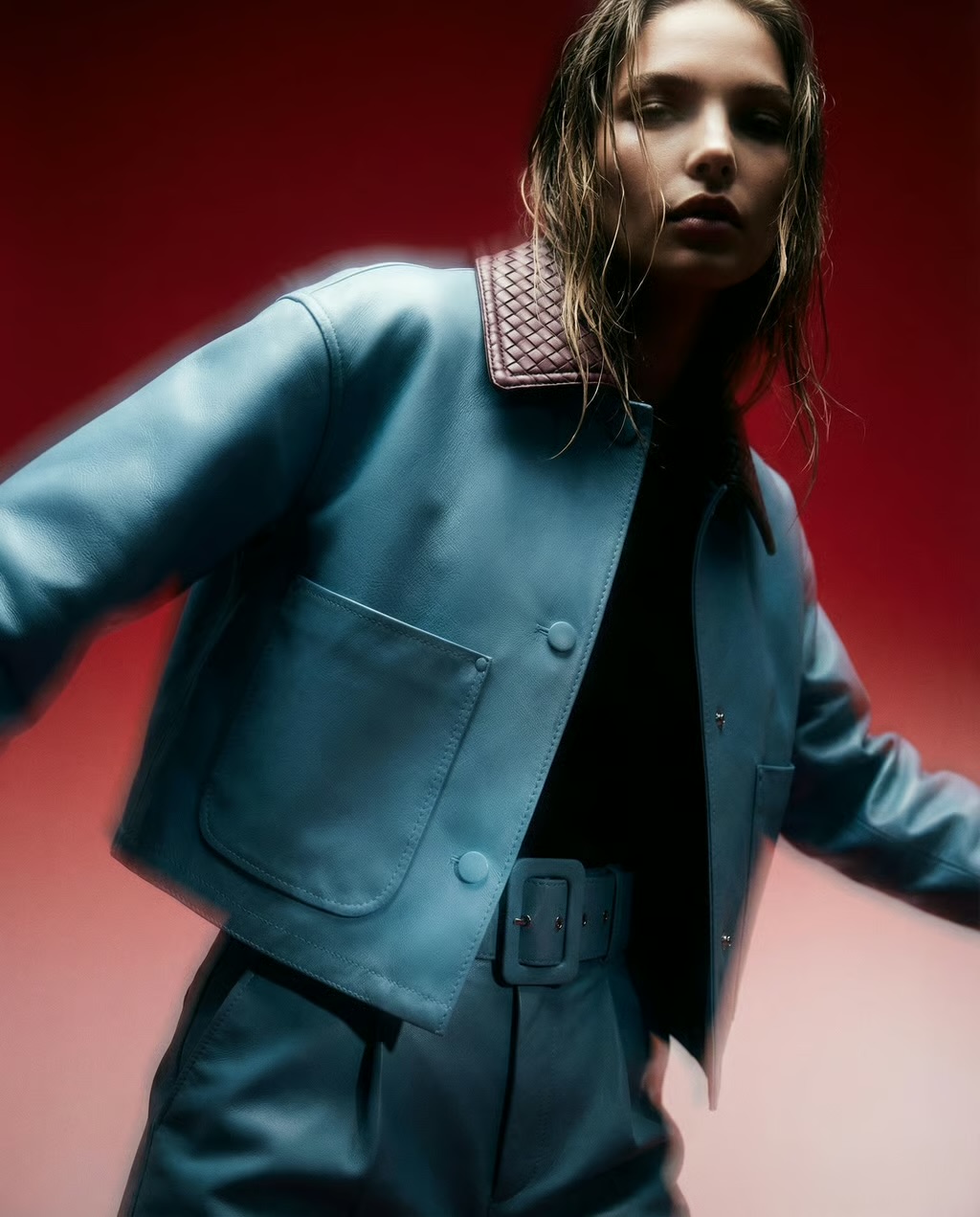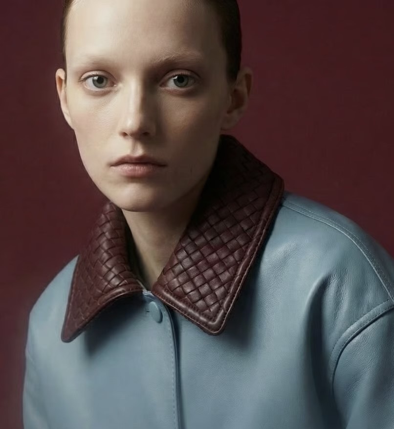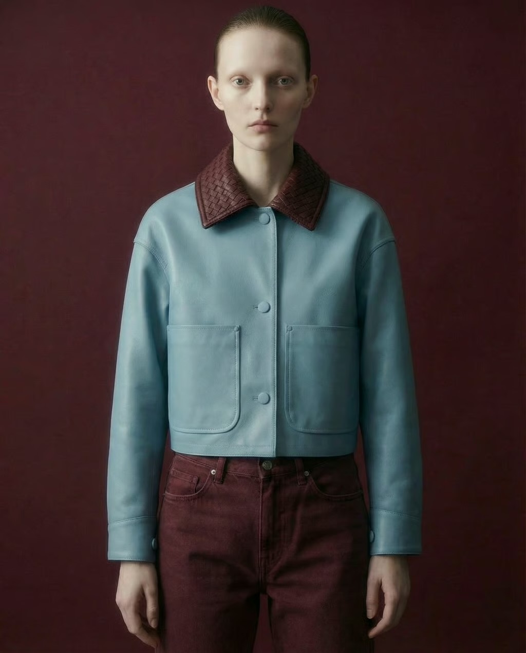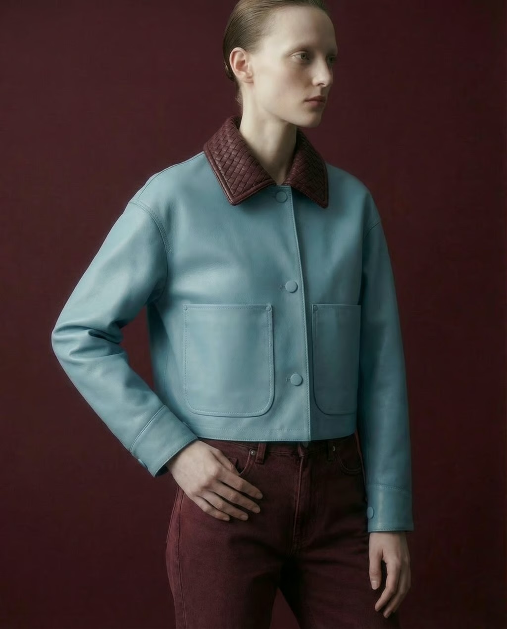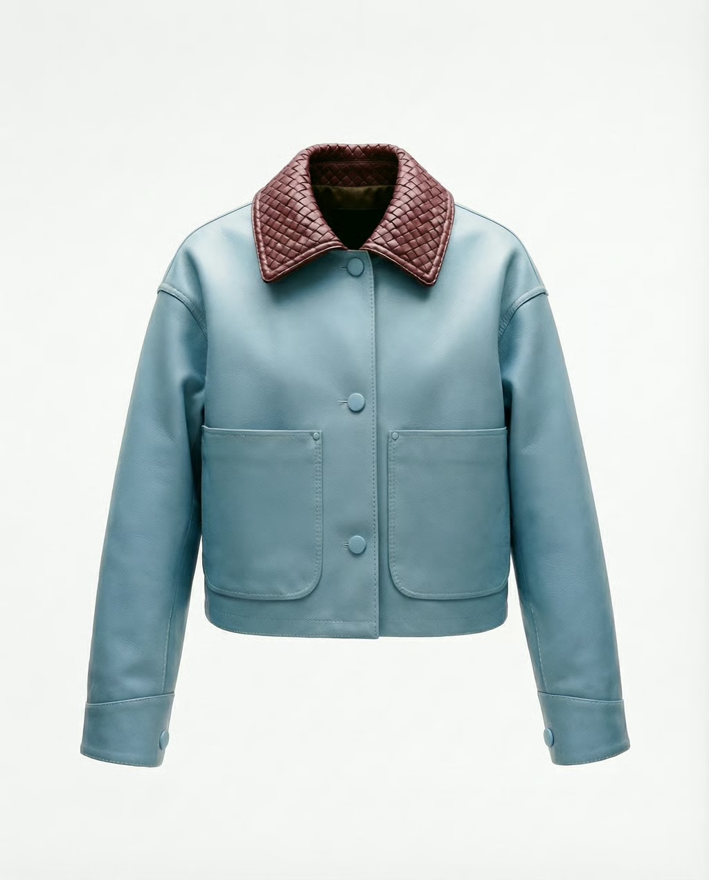 Skye Leather Jacket is a modern statement piece crafted from soft sky-blue leather, accented with a quilted burgundy collar for a refined contrast. Featuring a relaxed fit, snap-button closure, and oversized patch pockets, it blends effortless style with everyday versatility. Perfect for elevating both casual and polished looks.