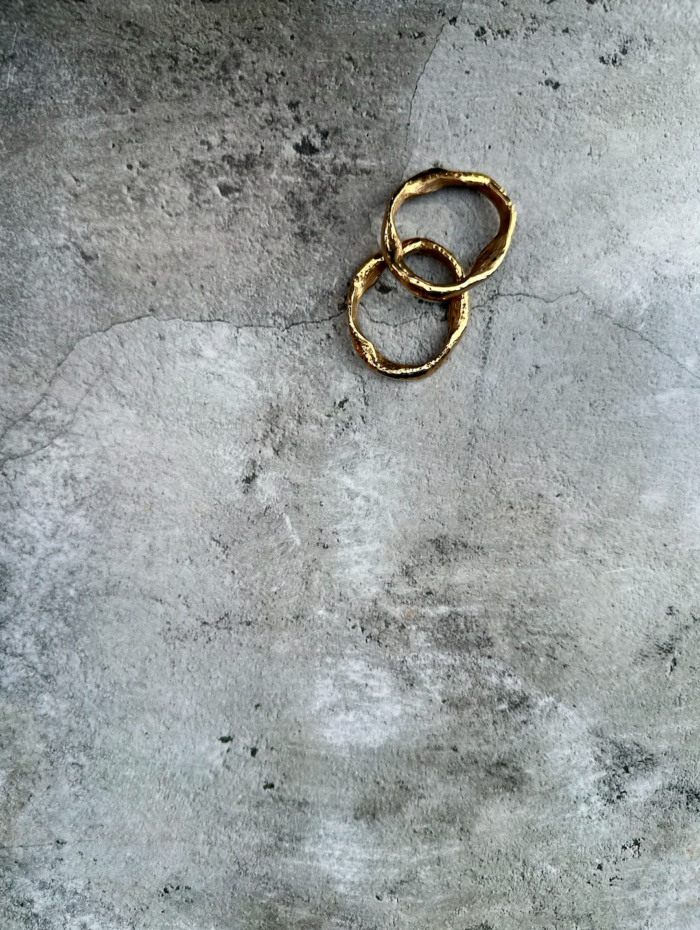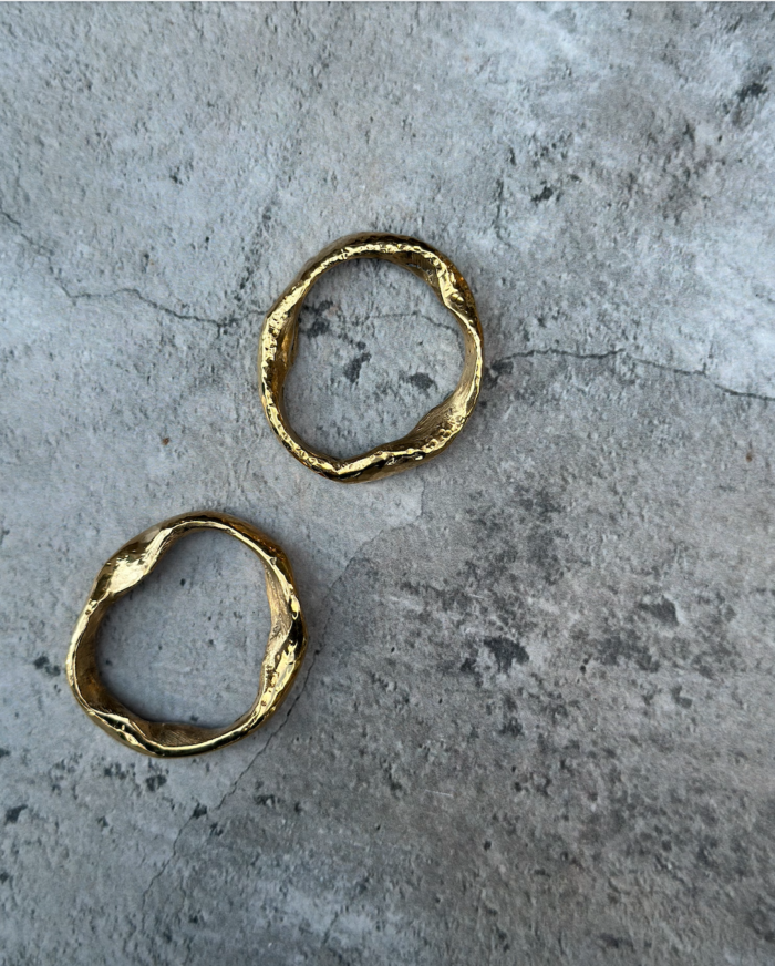 A set of 8 napkin rings – a playful take where metal meets memory—hand-cast molten brass napkin rings, shaped by flame and craftsmanship.