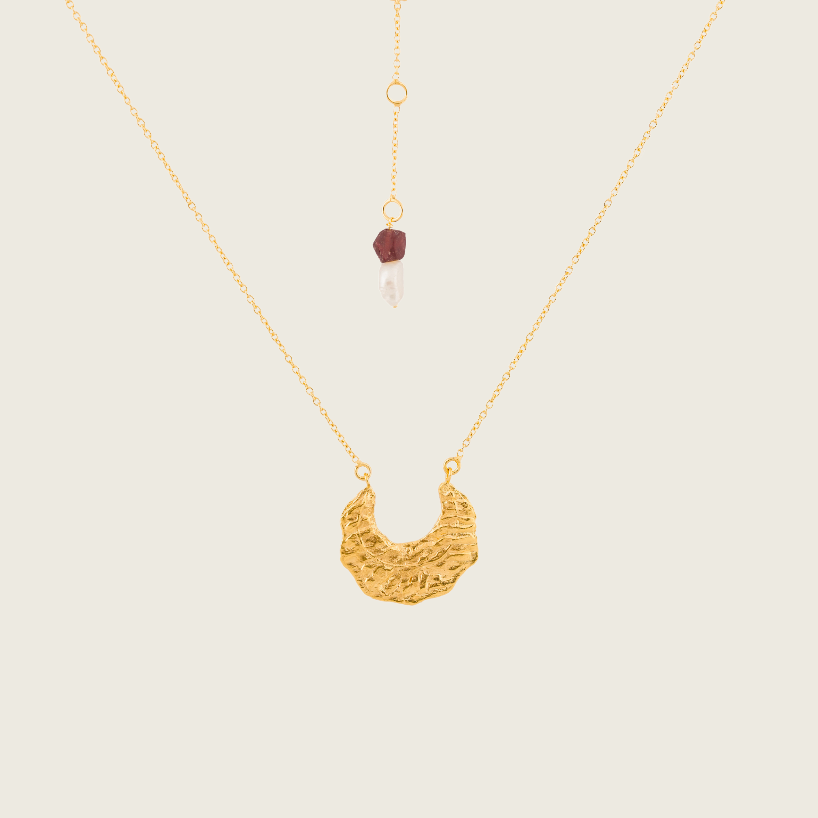 Merging life’s contrasting forces, the necklace is embellished with a freshwater pearl and a deep red garnet at the tail end, mirroring the delicate balance between our daily existence and the volcanic forces of nature.