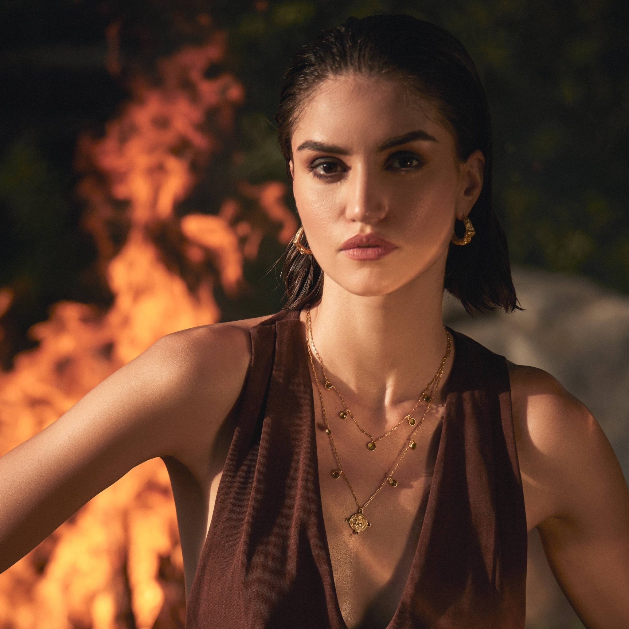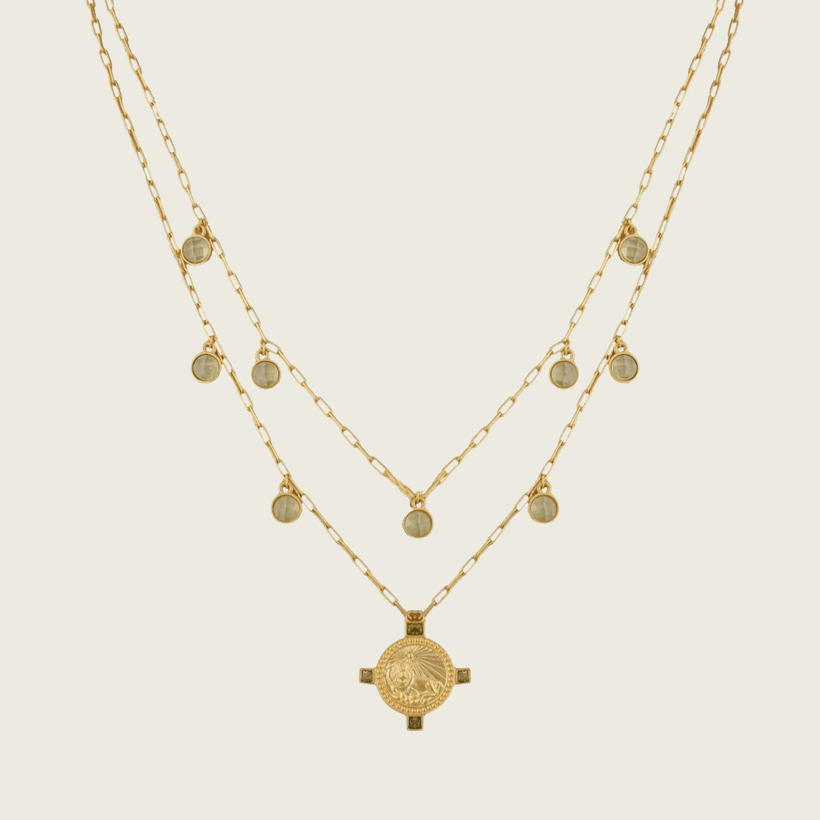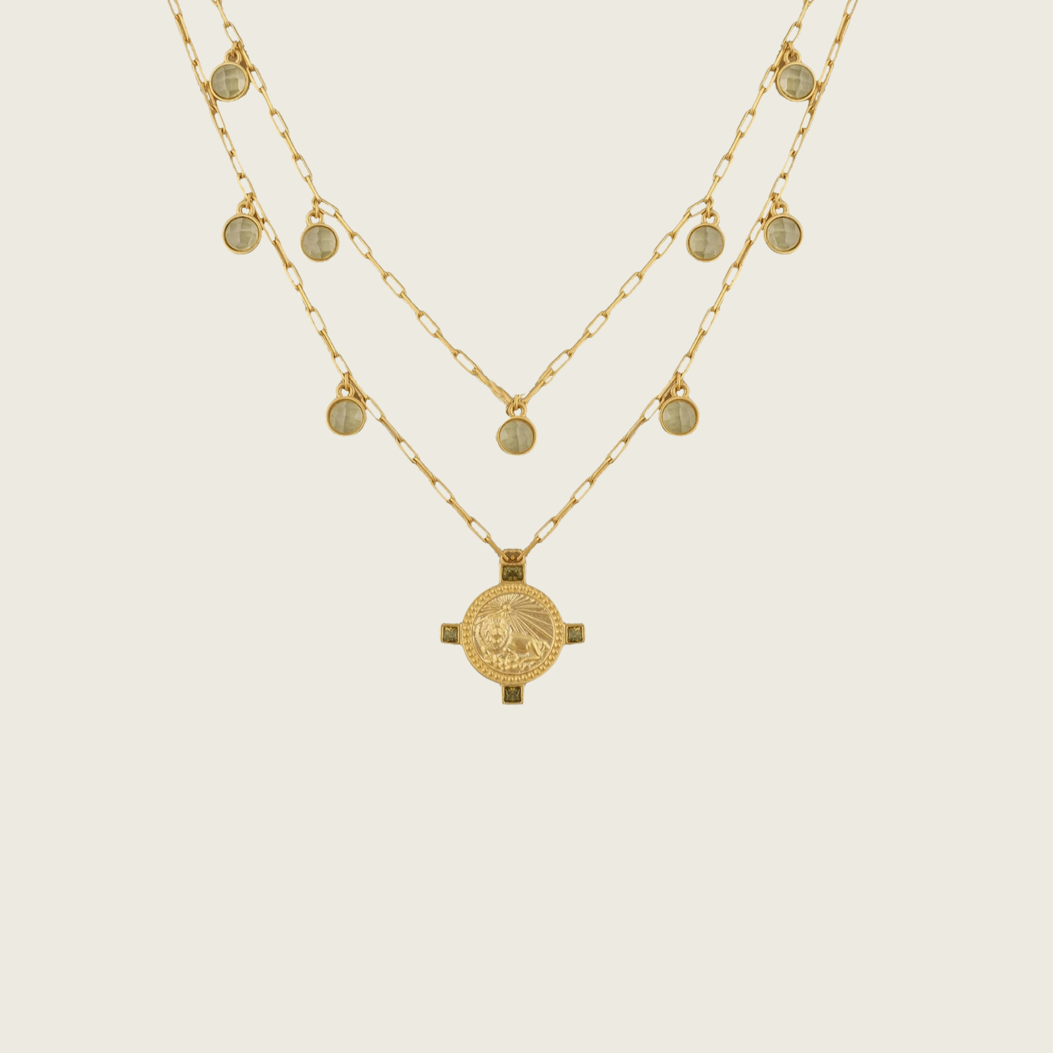 Presented as a layered double necklace with the upper chain attached.