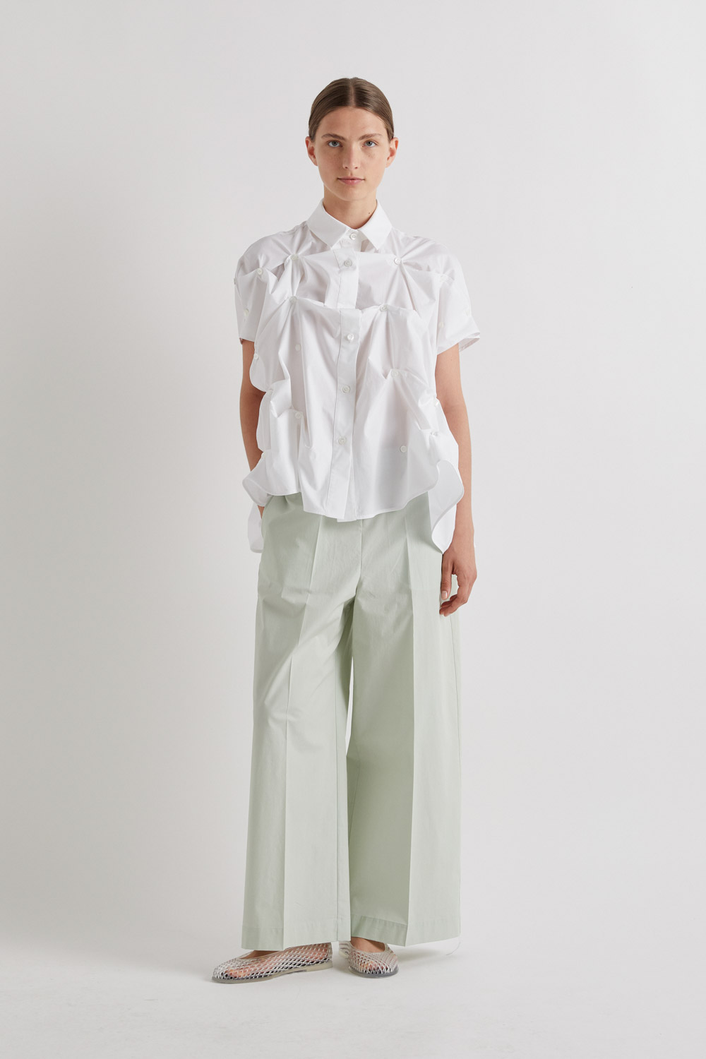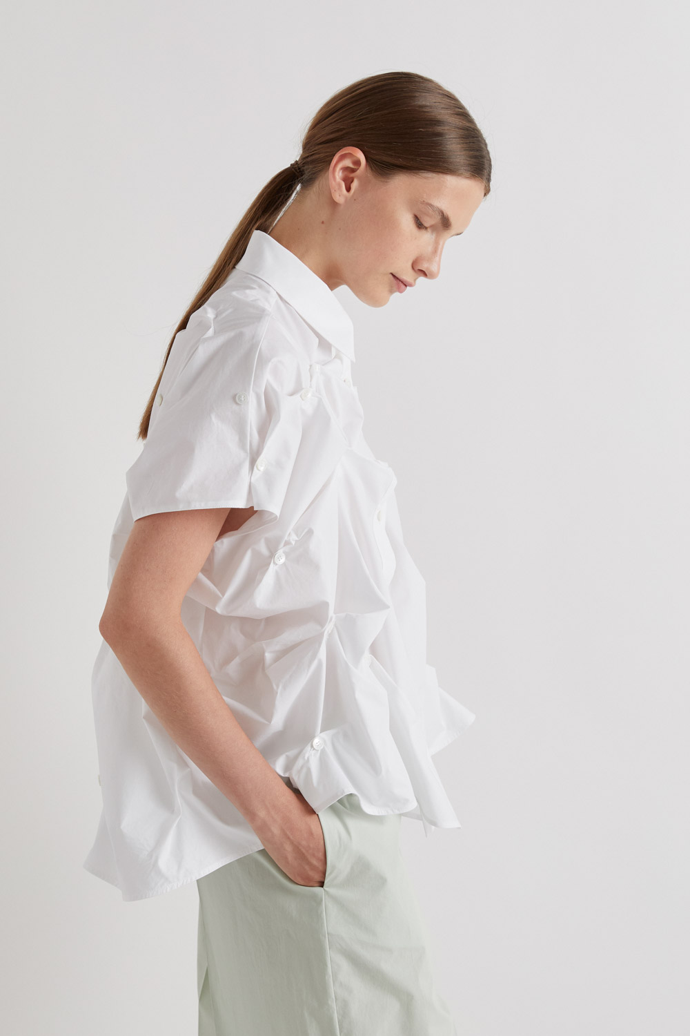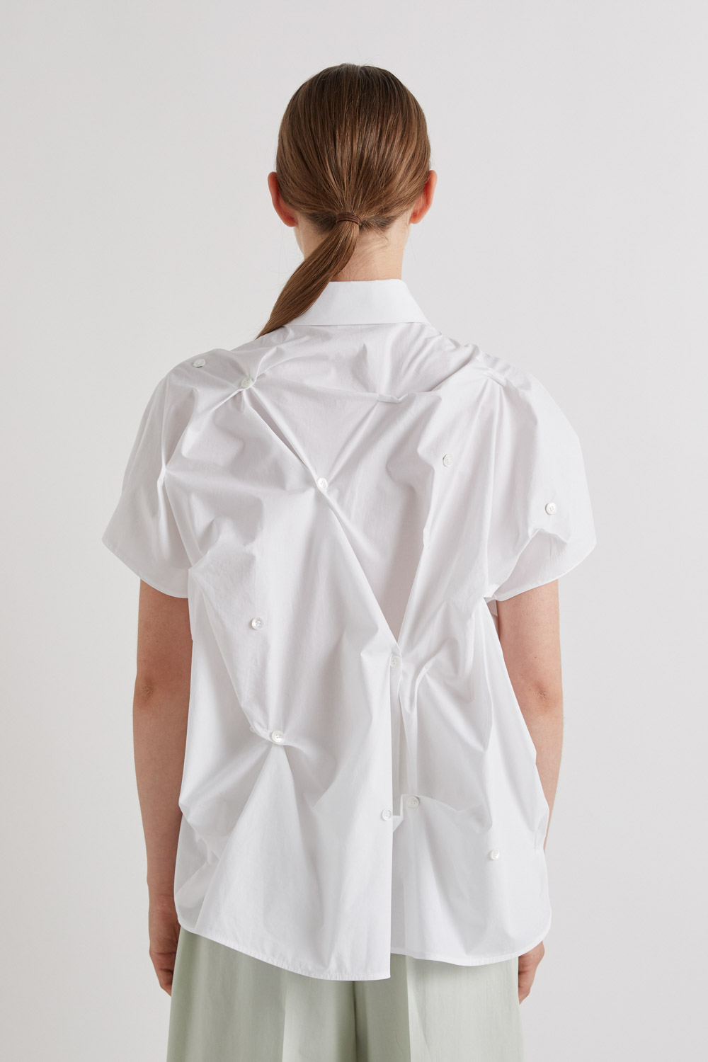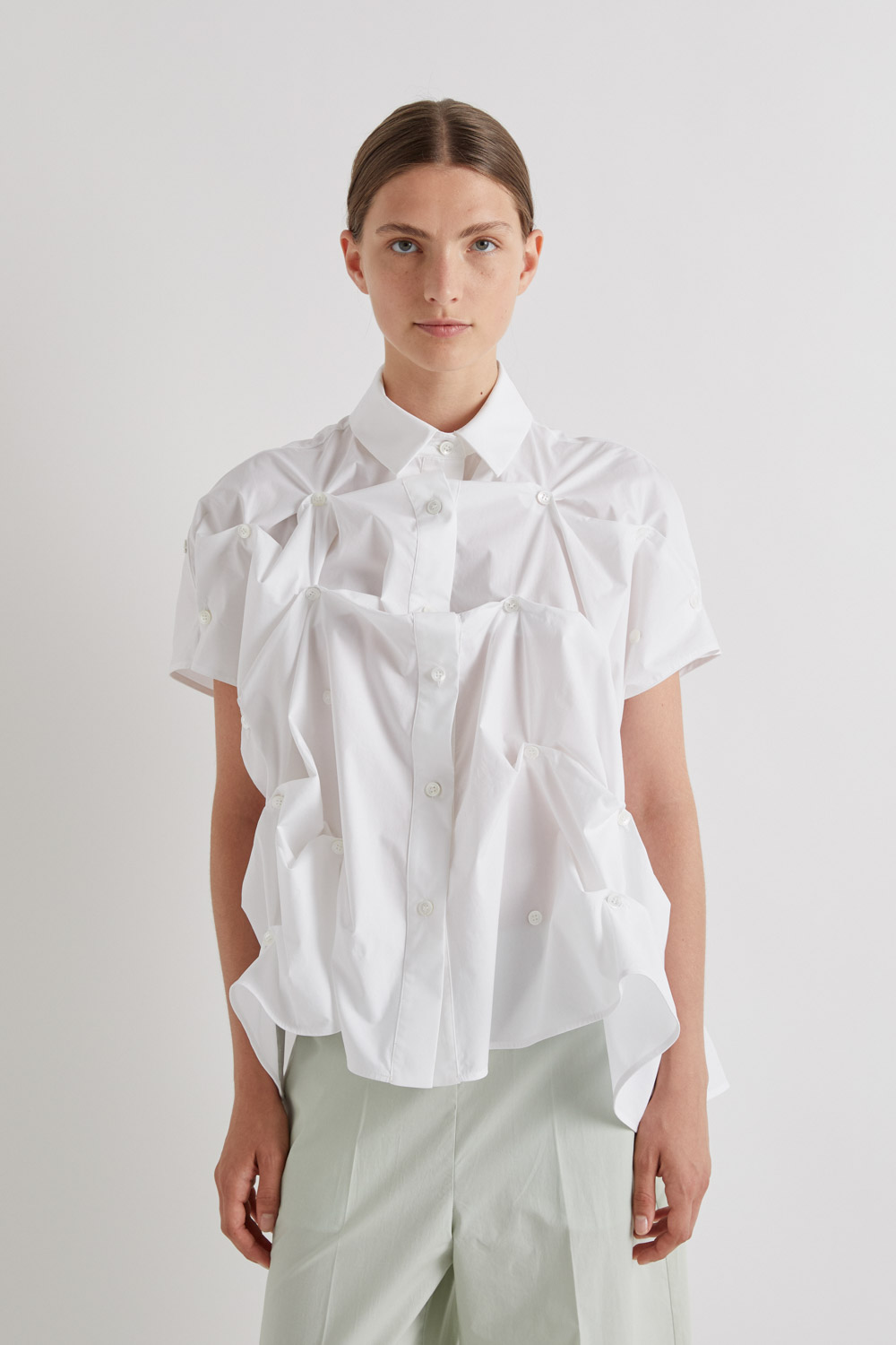 Elevate your wardrobe with this 100% cotton white shirt, designed with a classic collar and full button-down front. Featuring thoughtful gathers across the front and back, each cinched with a button, it creates a runway-inspired silhouette that’s uniquely stylish.