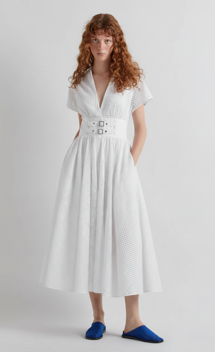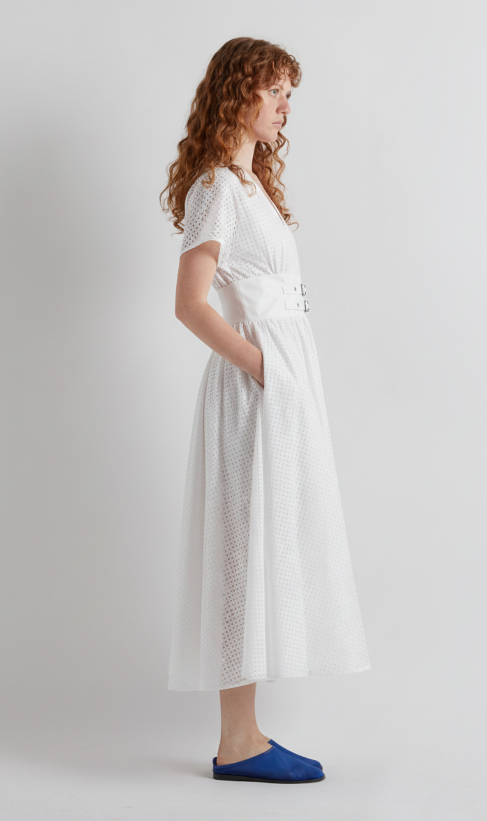 White Double Belted Eyelet Dress